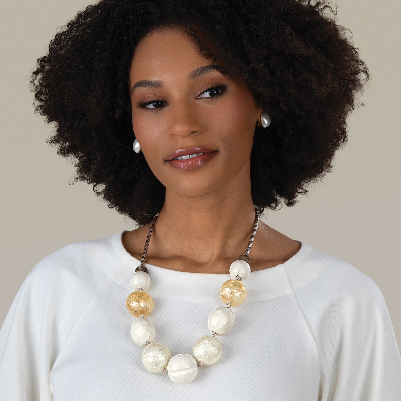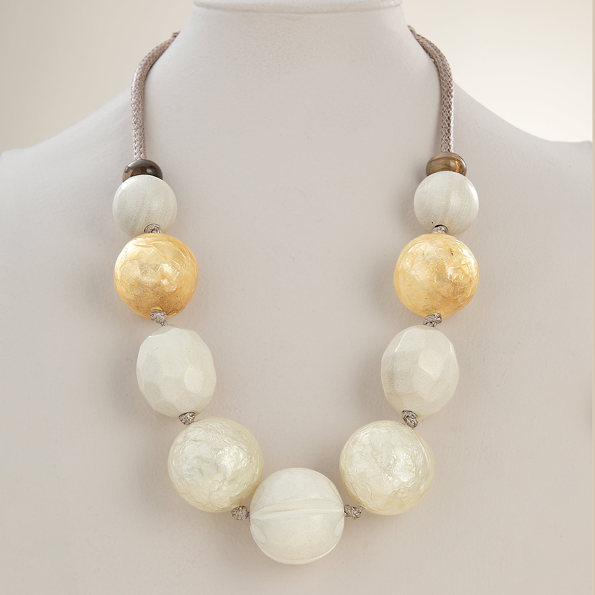What a fun and bold statement this costume jewelry piece makes! Although two of the bobbles (Capiz shell?) are not as yellow in color as pictured online, this necklace may prove to be one of my favorite pieces.
