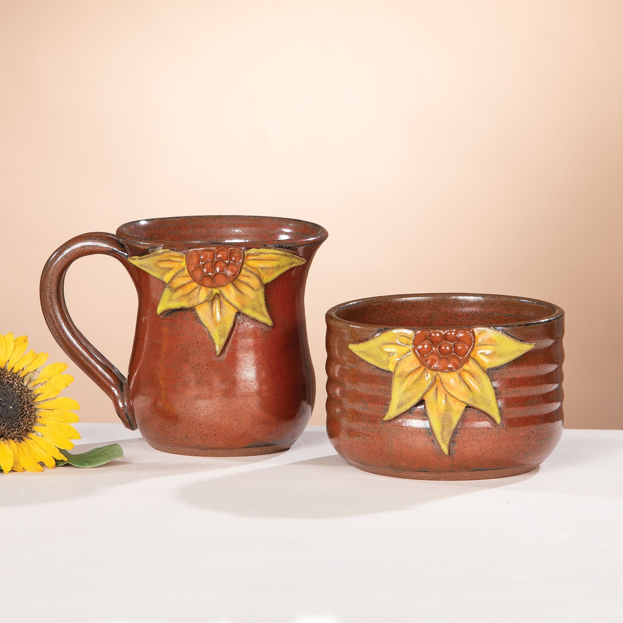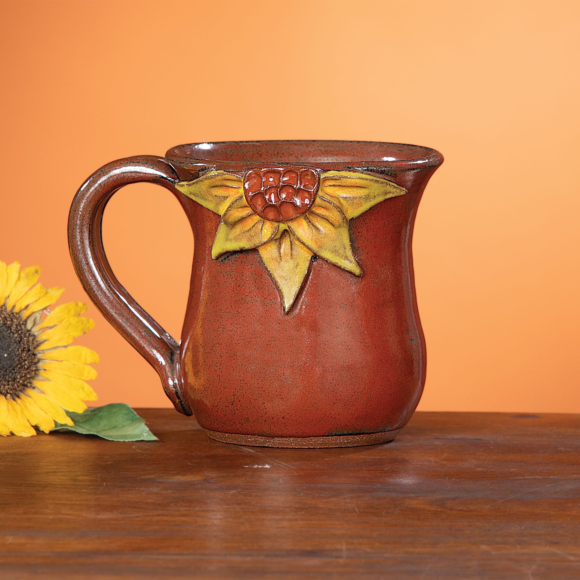 JoAnn of the Poconos creates this adorable hand-painted stoneware piece starting at a potter's wheel. She adds the whimsical design and paints the mug to look like terracotta and features half of a detailed sunflower. Handcrafted exclusively for Uno Alla Volta, from the hearts and hands of artisans. Microwave, dishwasher and food safe. Approx. 5'' tall, holds 14 oz.