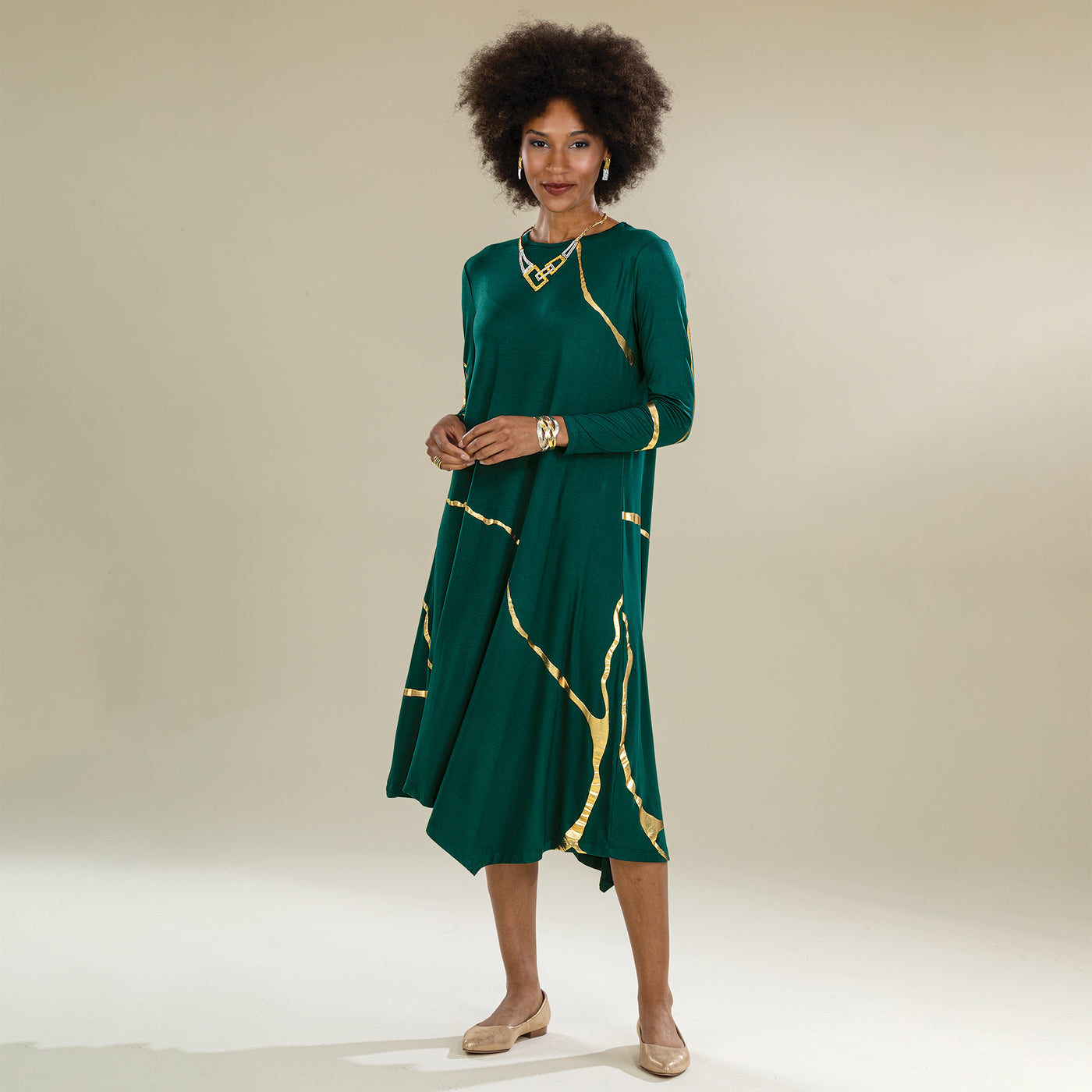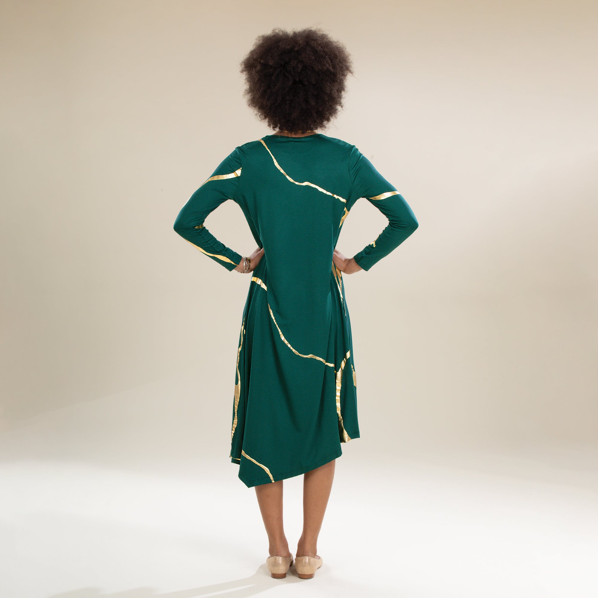 Our artisan, Miriam of Florida designs this beautiful dress. The shimmering gold strokes are an interpretation of Japanese Kintsugi art. Features 3/4 sleeves. Handmade in Portugal from pine green Italian viscose and elastane. Limited edition. Available in: S 4-6, M 8-10, L 10-14, XL 14-18, 2X 18-20, 3X 20-22.