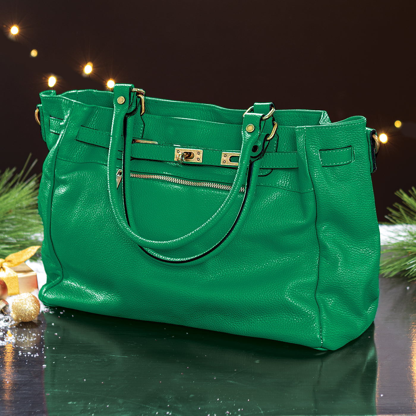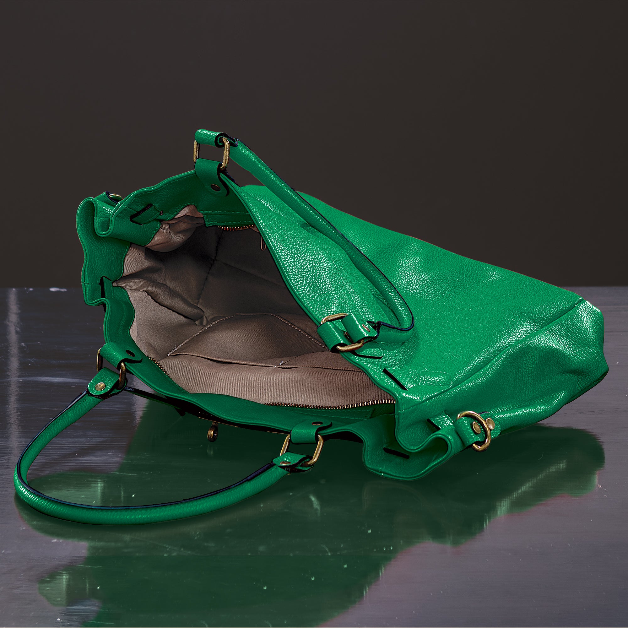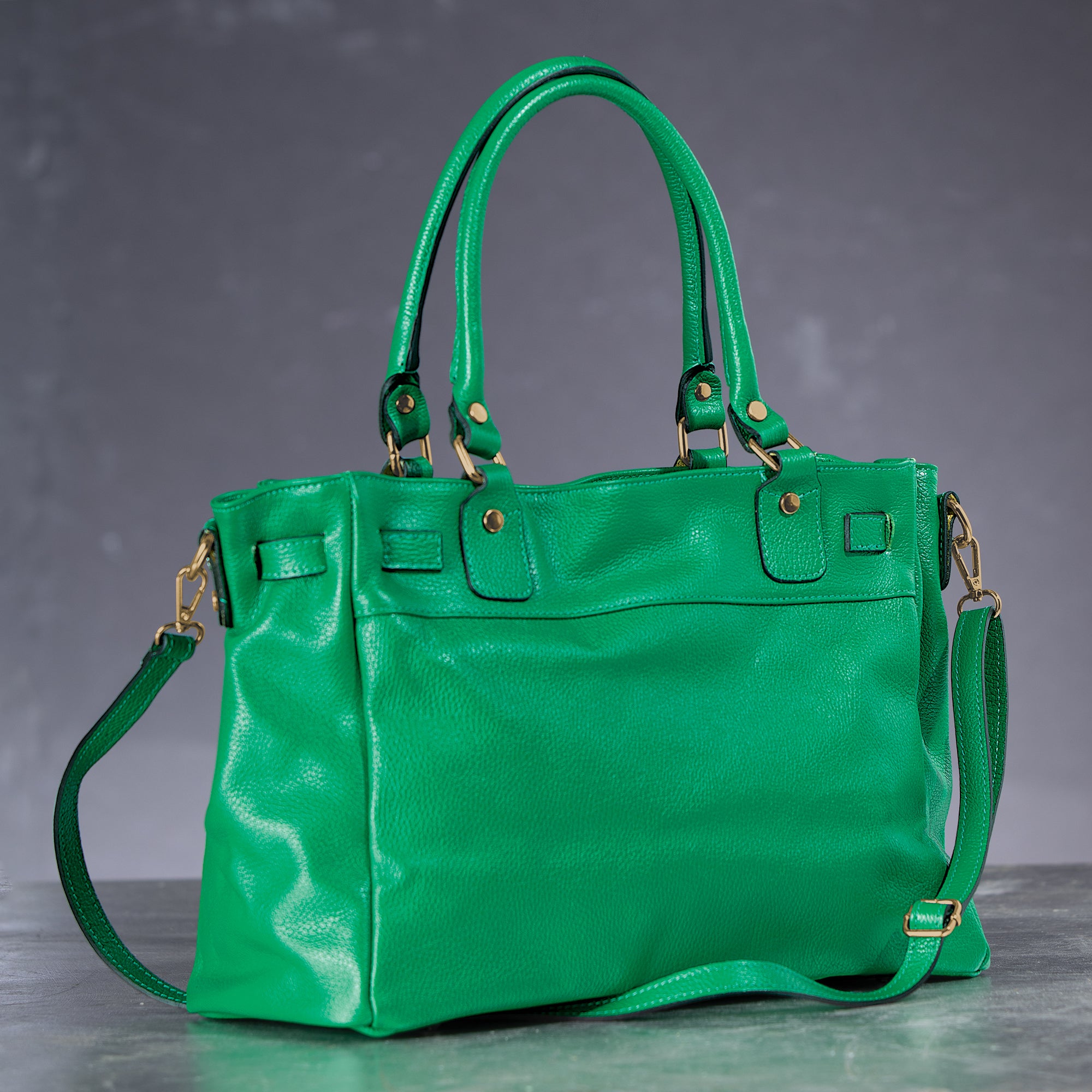 Artisan Marco of Florence creates this roomy handbag with supple Italian leather in a rich emerald green with gold hardware. Approx. 16'' x 6.5'' x 11'', with 12'' handles, a 17.5'' removable and adjustable crossbody strap, tan lining, one zipper pocket, two inside pockets, and zipper closure.
