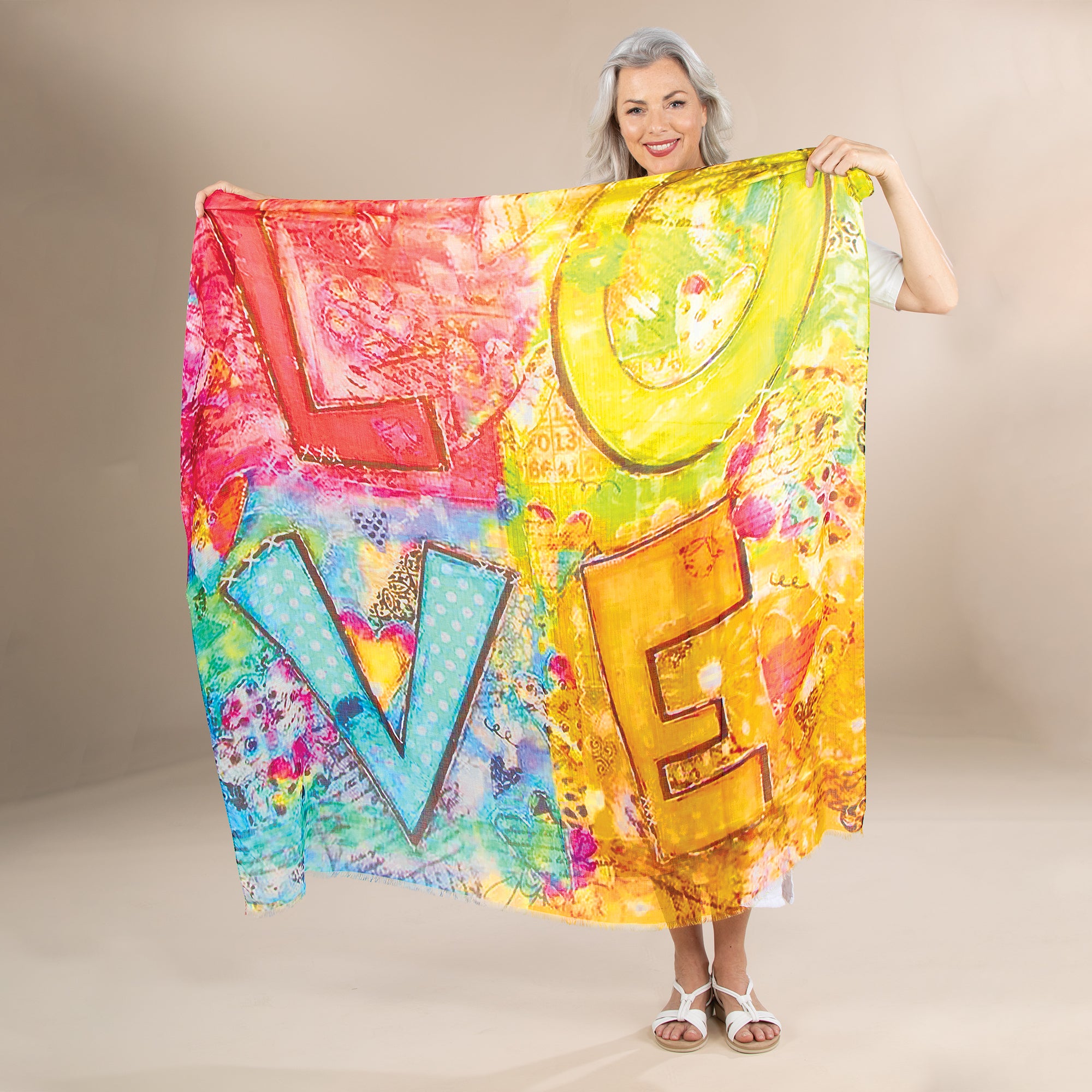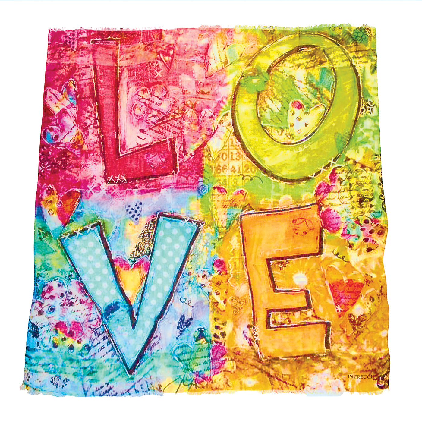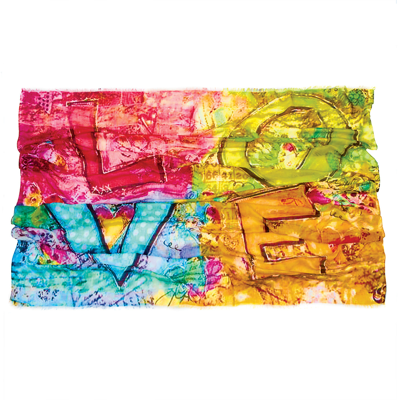 Our Artisans Of Lake Como create this fun and colorful scarf with ''love'' written in pink, green, blue & orange letters. Modal silk blend, flat and fringed hems. 55'' sq.