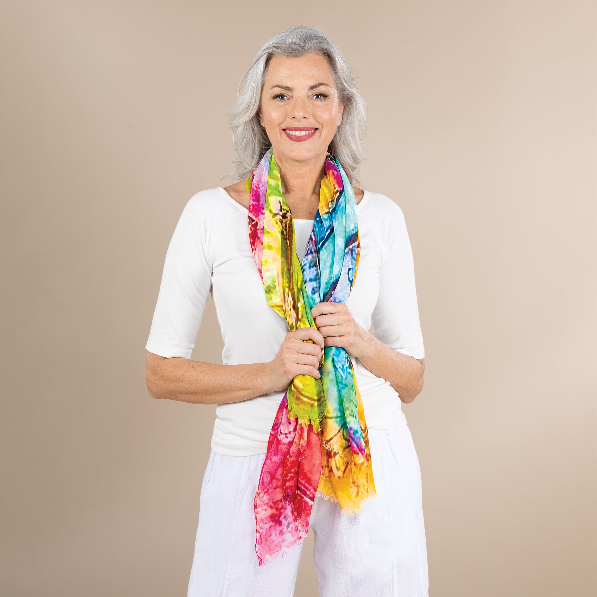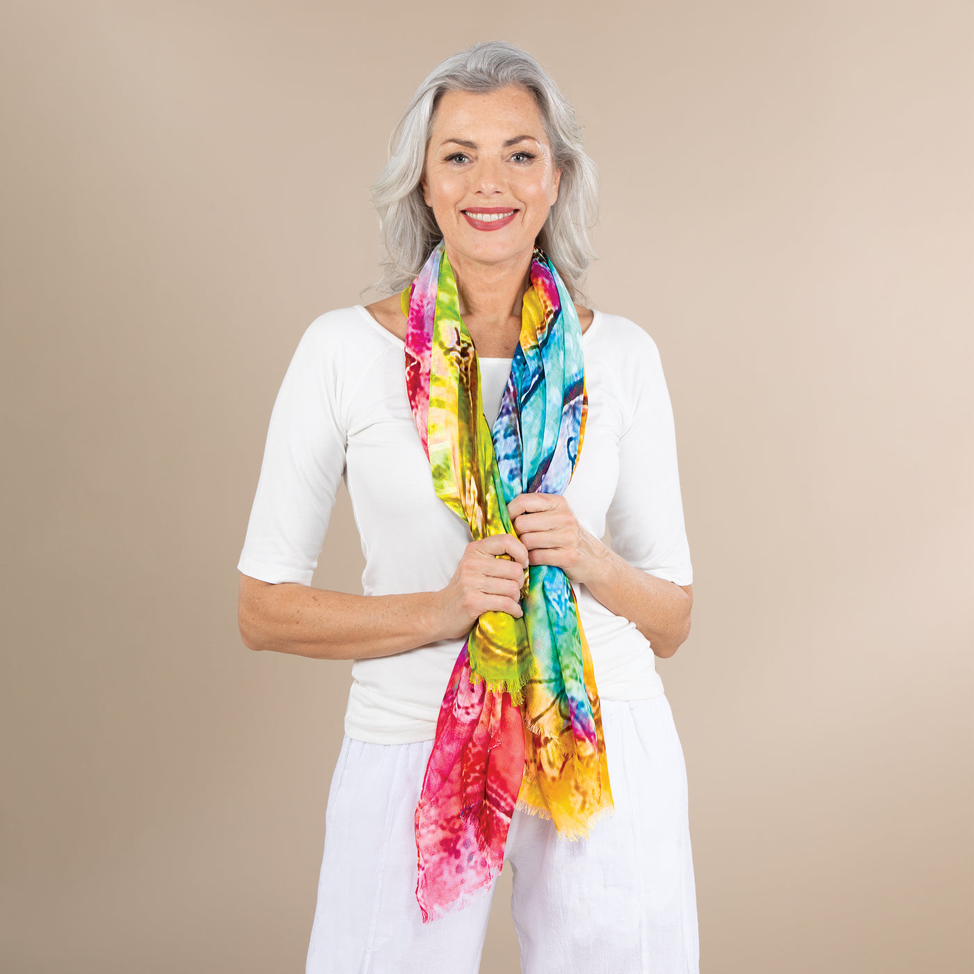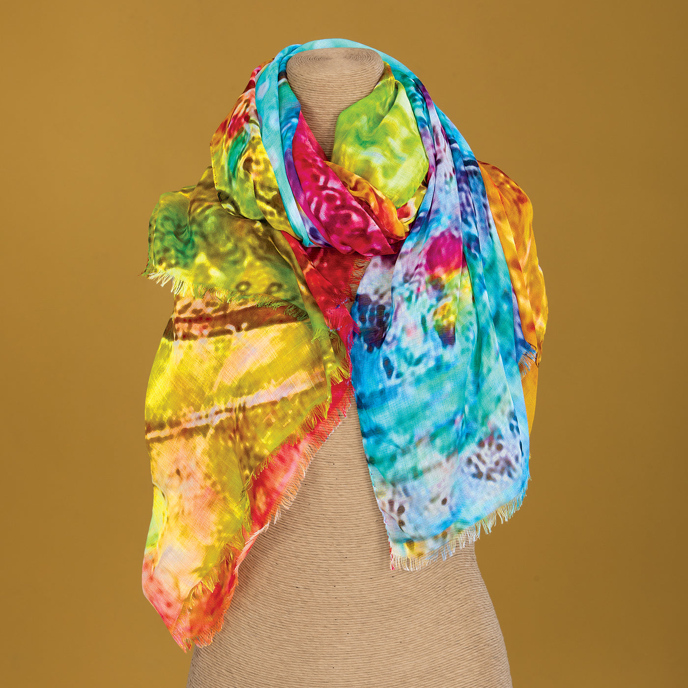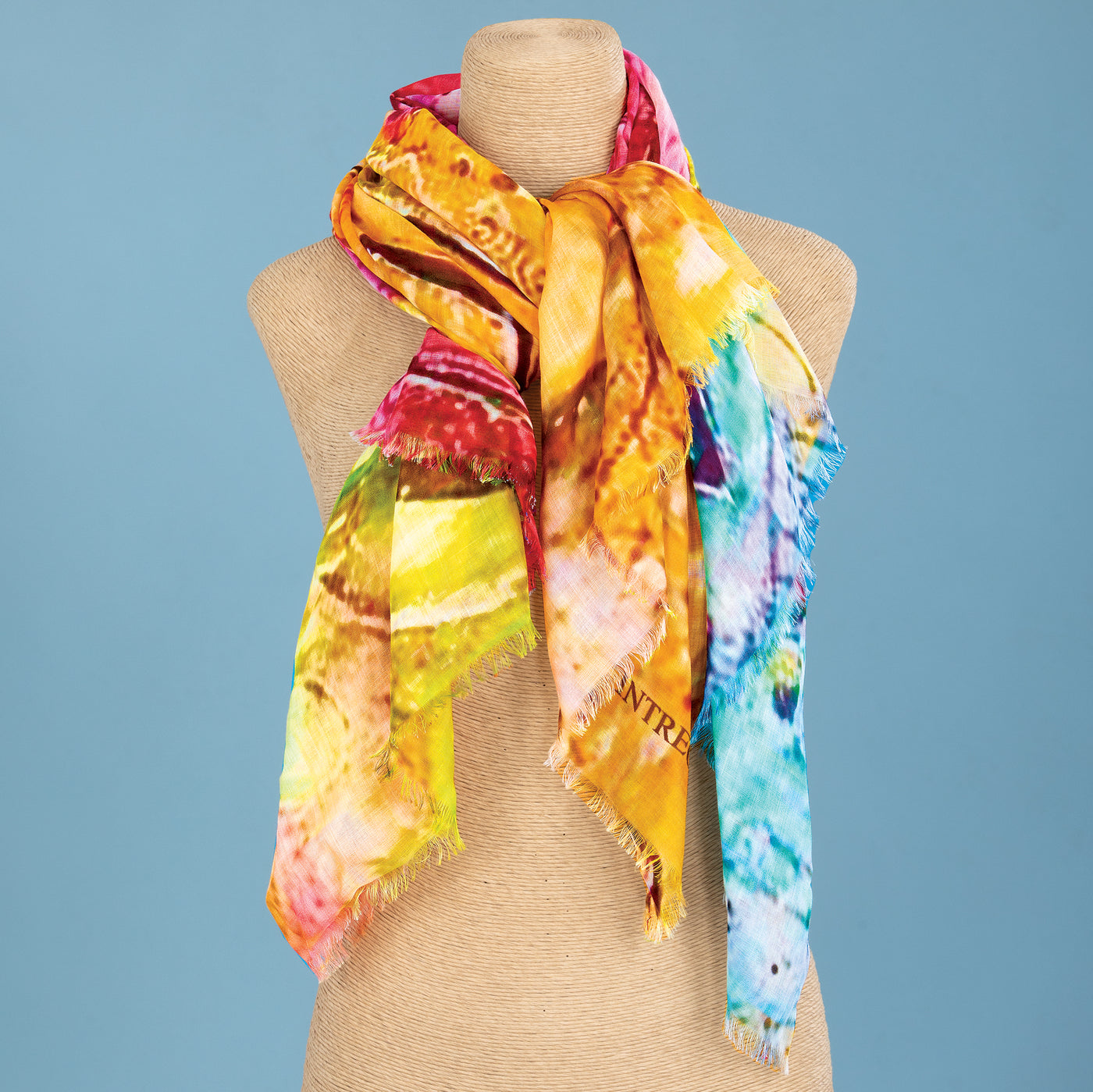 Our Artisans Of Lake Como create this fun and colorful scarf with ''love'' written in pink, green, blue & orange letters. Modal silk blend, flat and fringed hems. 55'' sq.