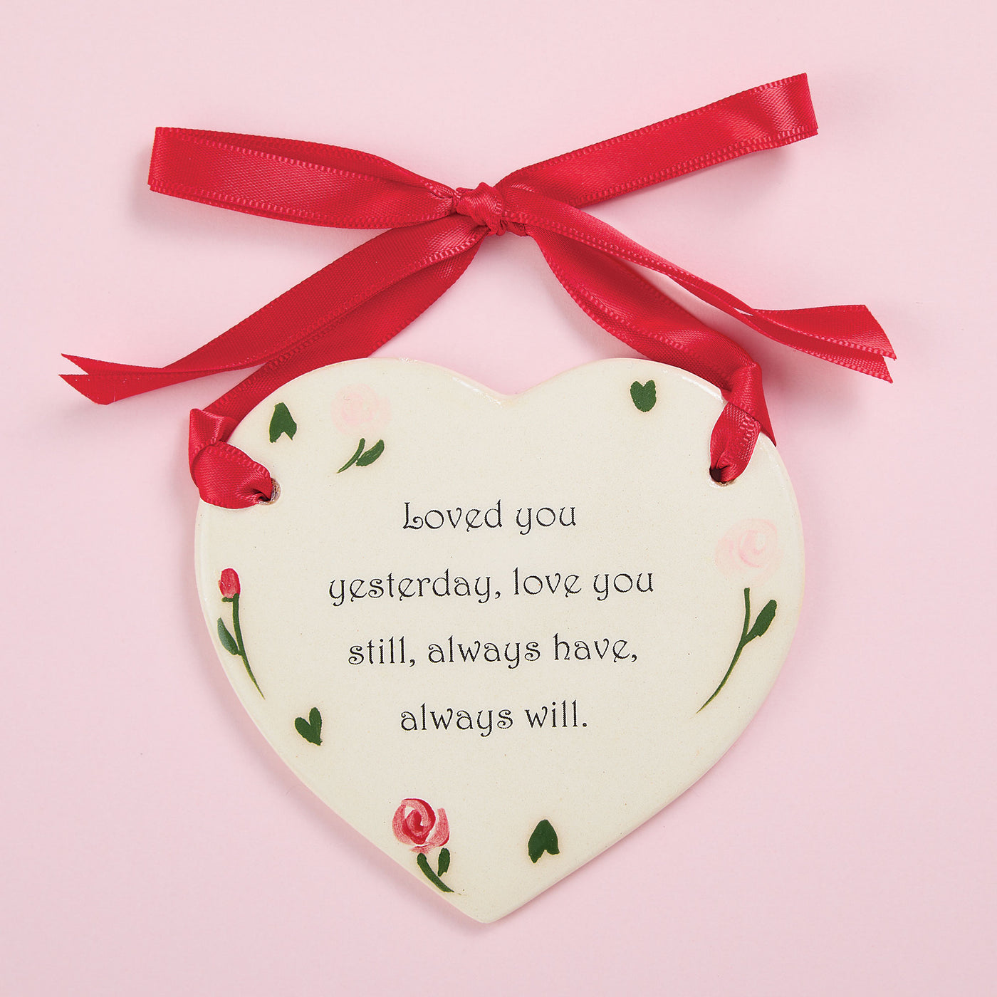 Artisan Nichole of Florida handcrafts this plaque from clay, then hand-paints it with floral details, and a message of love. Handcrafted exclusively for Uno Alla Volta, from the hearts and hands of artisans. Red satin ribbon for hanging. Approx. 4'' x 3.5''.