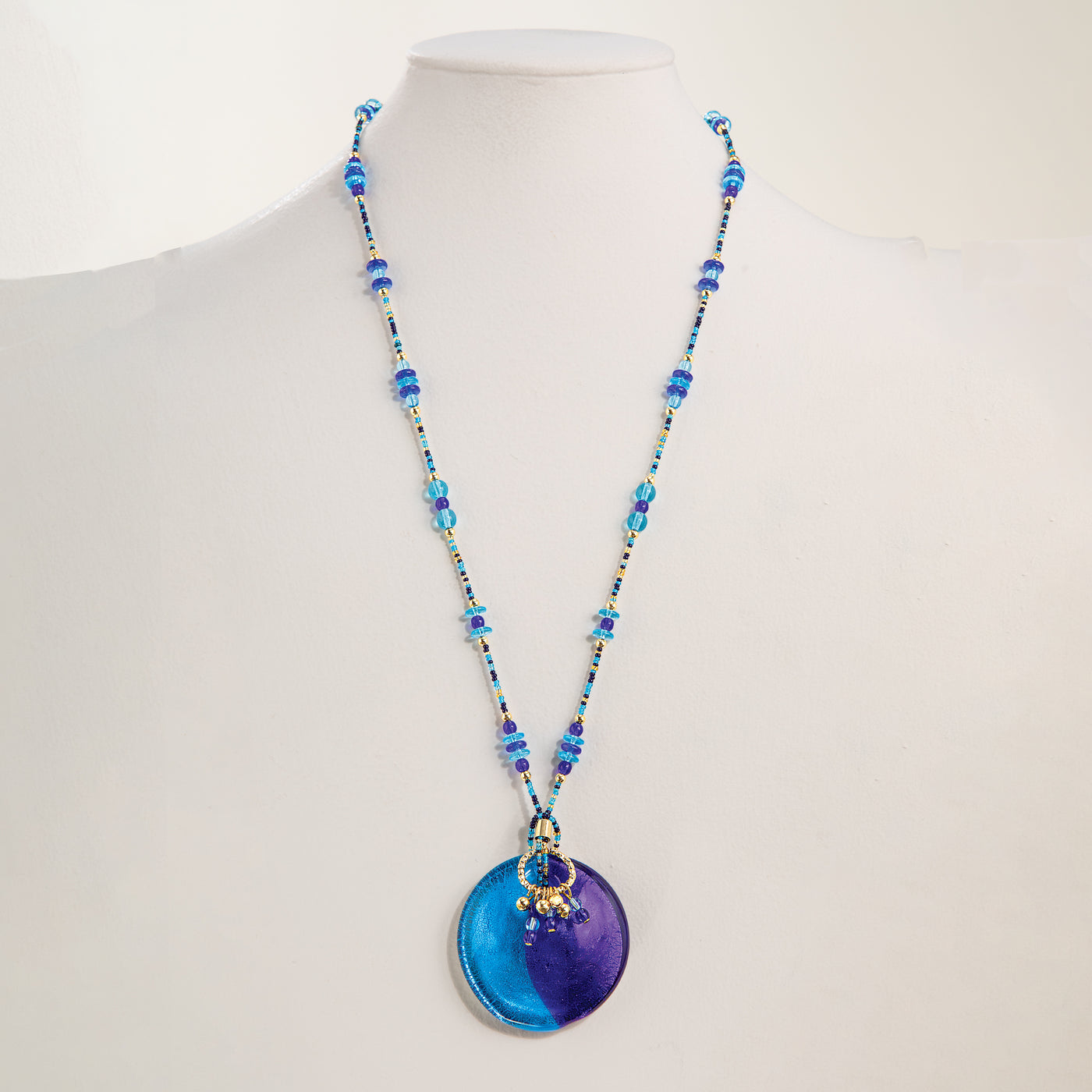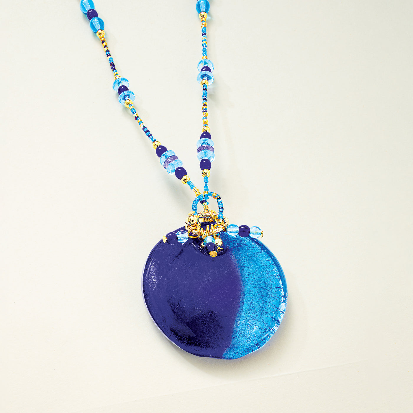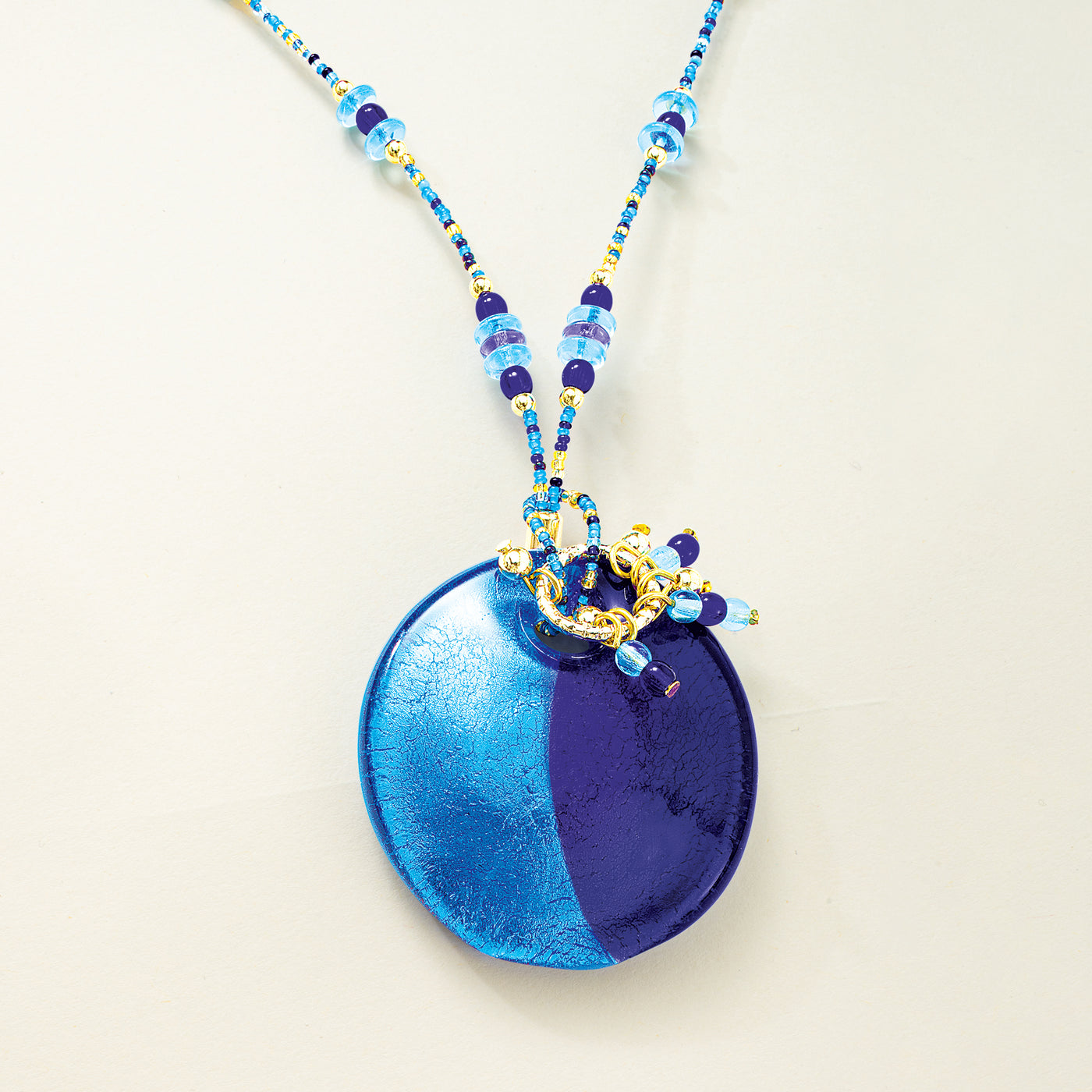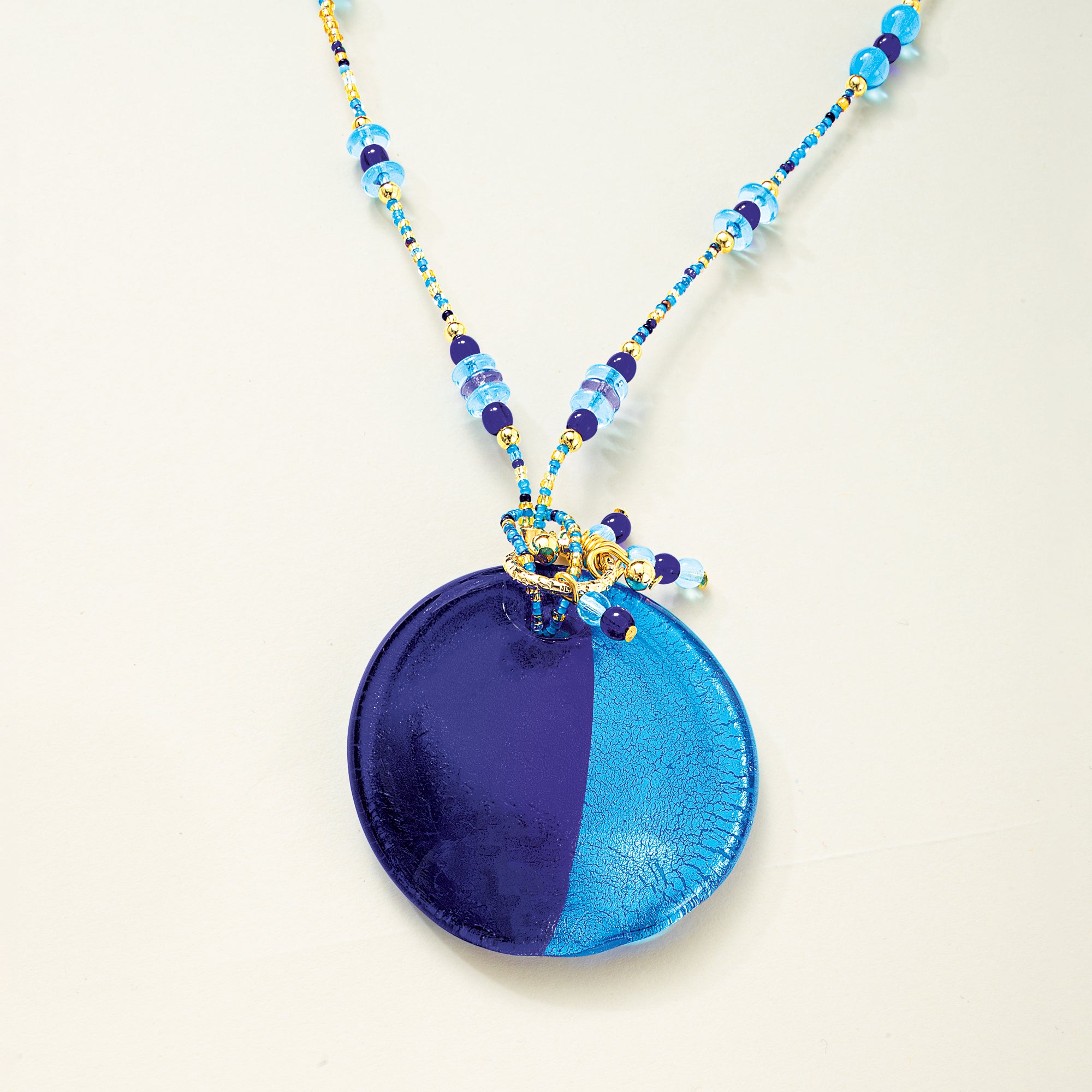 Artisans Valentina and Alessandra of Venice design and handcraft this magnificent Murano glass necklace. A large, cobalt blue lampworked circle pendant is accented with a golden ring filled with complementary beads. Suspended from a strand of blue-hued Murano glass beads, chips and golden seed beads. Handcrafted exclusively for Uno Alla Volta, from the hearts and hands of artisans. As each piece is a hand-blown work of art, design and colors will vary slightly. Approx. 23'' long, 2'' pendant, 2'' ext., lobster clasp.