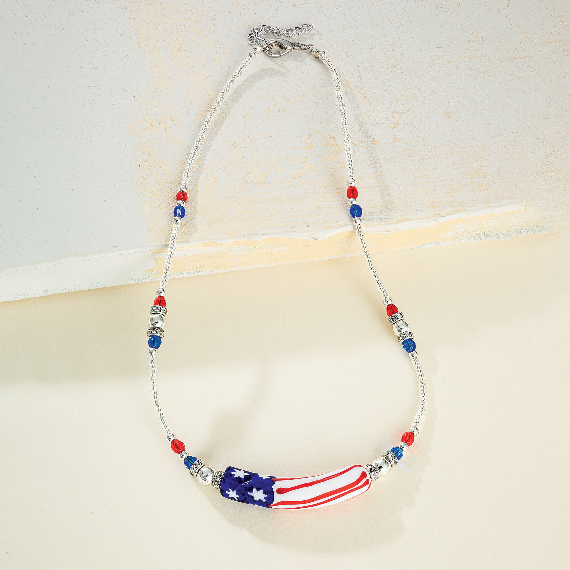 Artisans Valentina and Alessandra create this necklace handcrafted with a lampworked Murano glass focal bead styled like an American flag. It is surrounded by complementary accent and silver foil-infused seed beads. Handcrafted exclusively for Uno Alla Volta, from the hearts and hands of artisans. Approx. 17'' long, 2'' ext., lobster clasp.