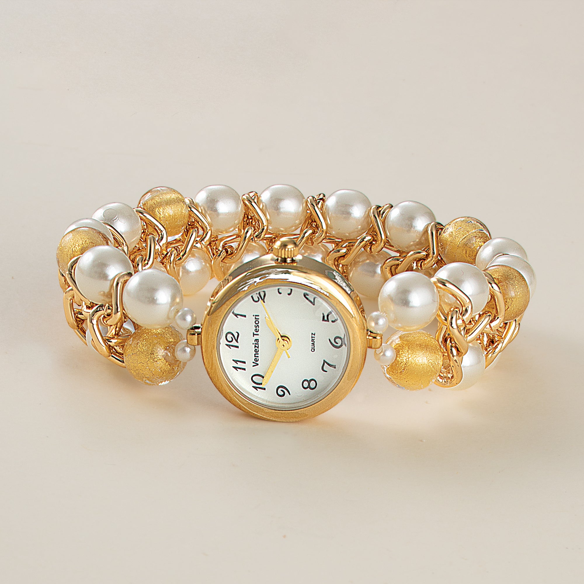 Artisans Cristina and Pierluigi of Venice handcraft this watch with a double band of Murano glass pearls and gold foil-infused beads. Accented with gold-plated spacers and findings, this piece is perfect for those who prefer a bracelet style watch. Handcrafted exclusively for Uno Alla Volta, from the hearts and hands of artisans. Features a 1'' dia. quartz face and stretches to fit most.