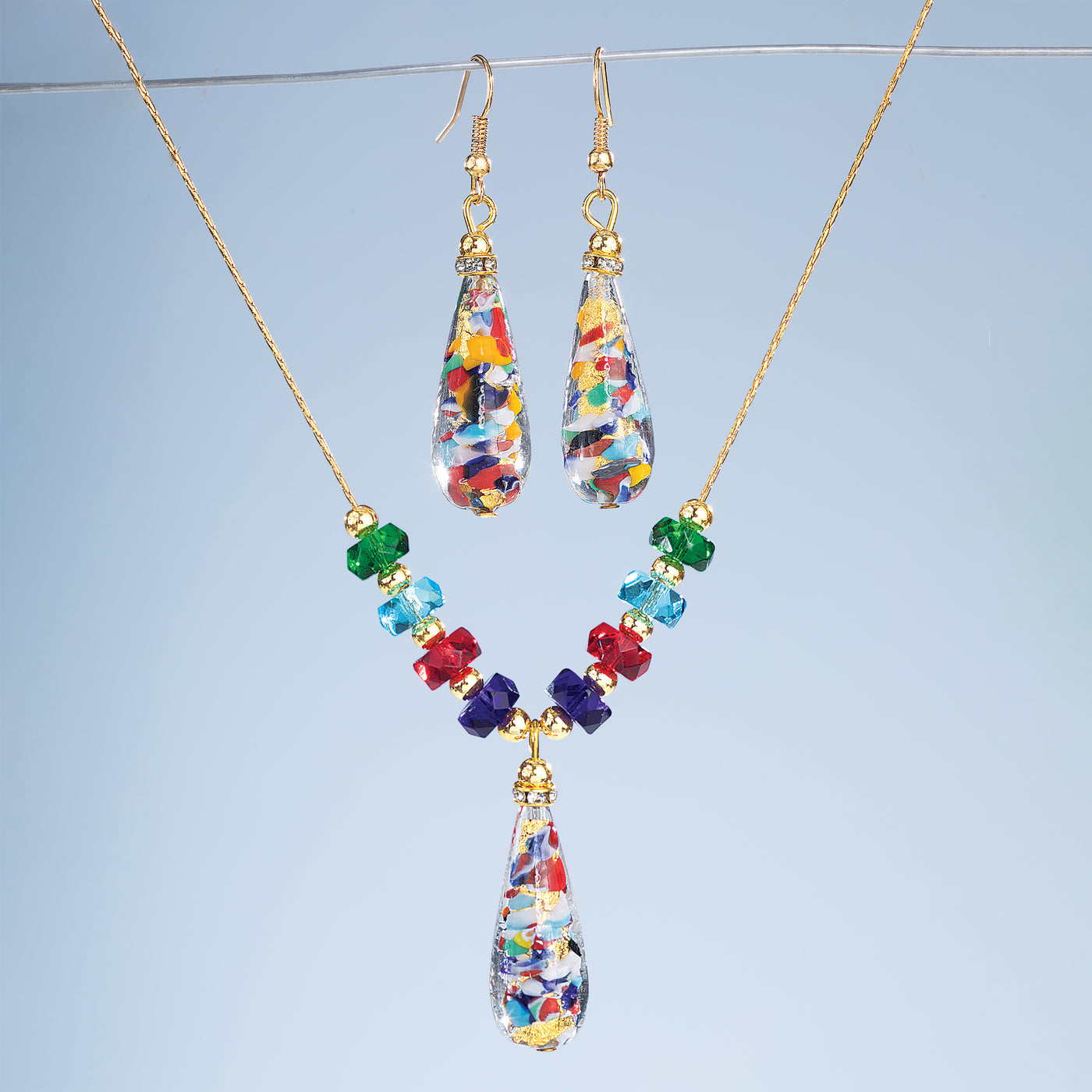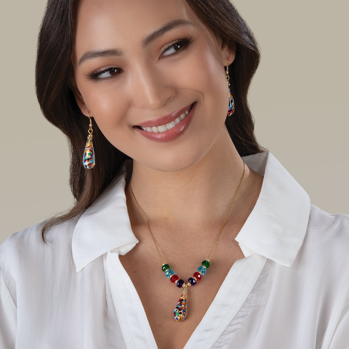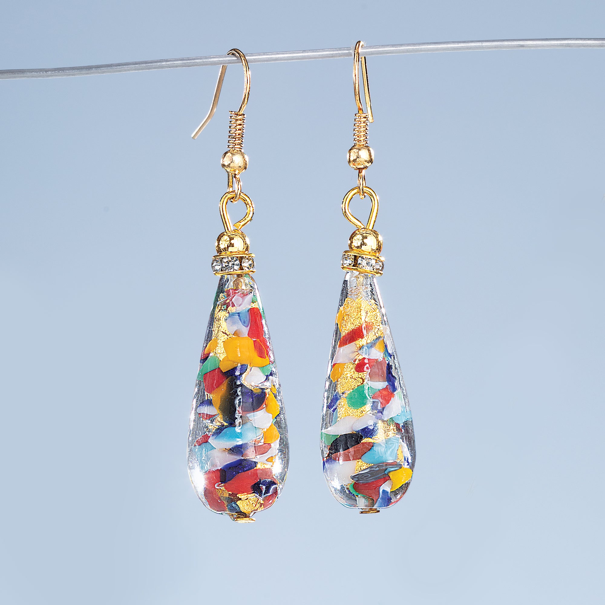 Valentina and Alessandra of Venice design and handcraft these colorful earrings featuring foil-infused Murano glass drops and accent beads. A perfect complement to the Rainbow Regal Raindrop Necklace. Handcrafted exclusively for Uno Alla Volta, from the hearts and hands of artisans. Approx. 2'' long, wires.