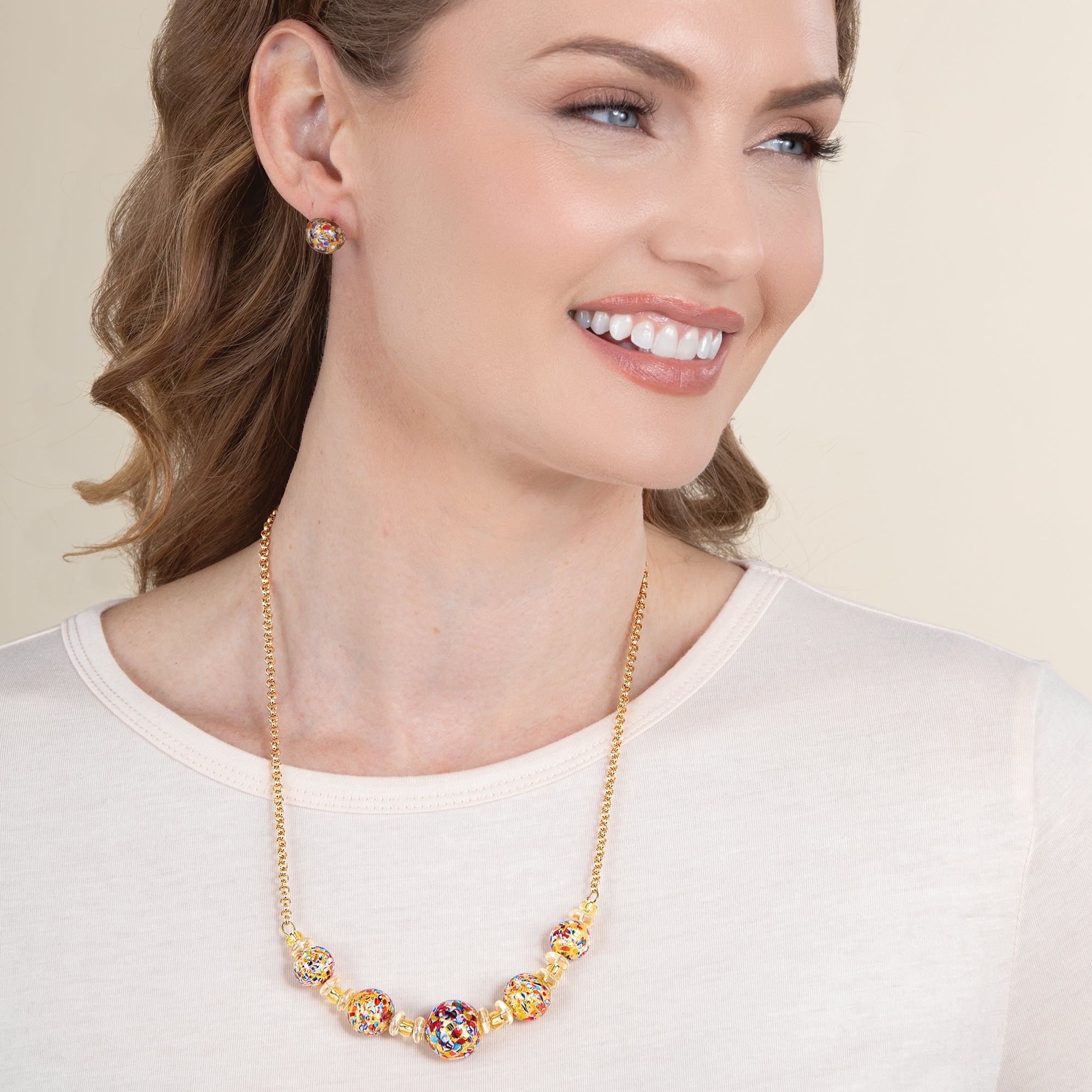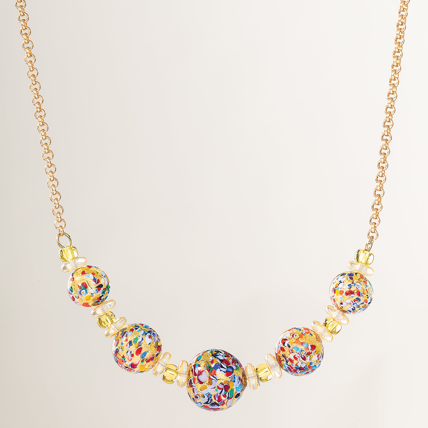Artisans Valentina and Alessandra of Venice design this eye-catching necklace with speckled Murano glass beads, filled with colors, and mixed with complementary accent beads. Suspended from gold-plated bolo chain. Handcrafted exclusively for Uno Alla Volta, from the hearts and hands of artisans. Approx. 21'' long, 2'' ext., lobster clasp.