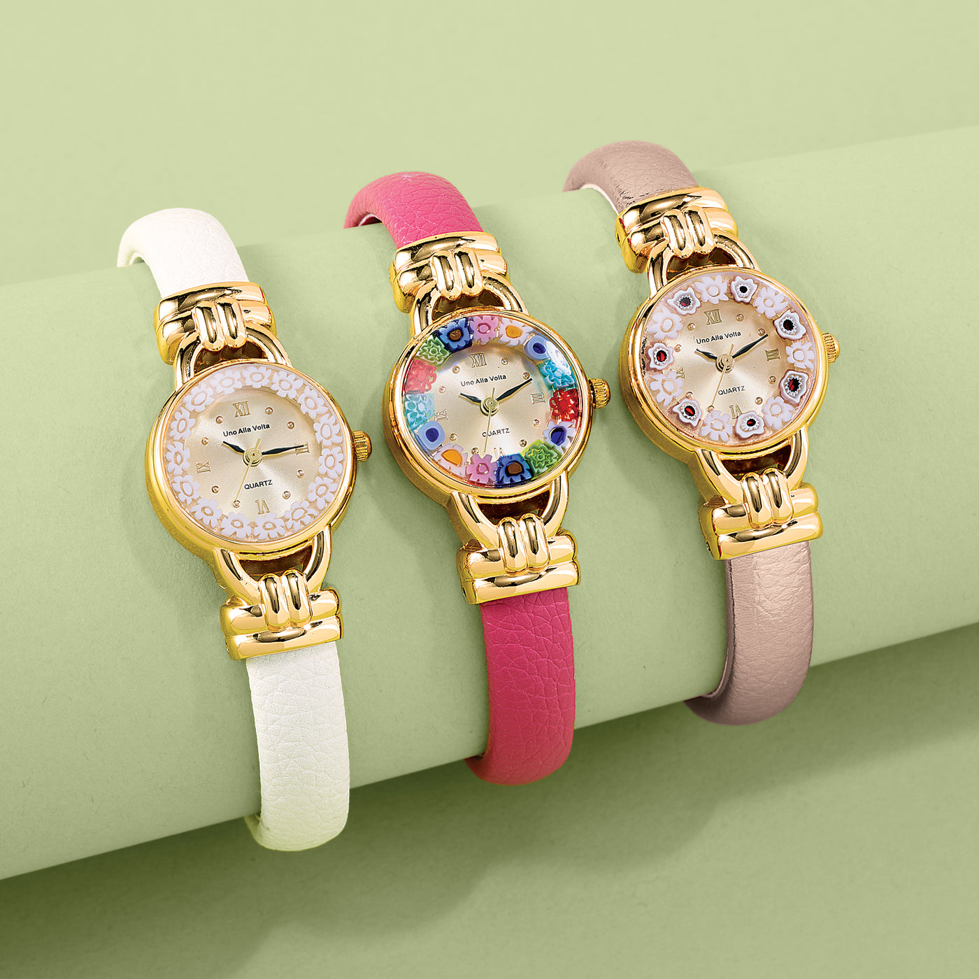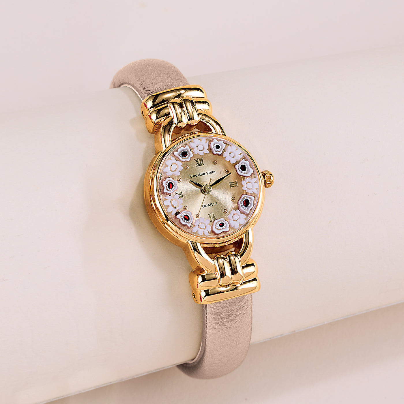 Our artisans of Italy craft this Murano glass watch with a white millefiori face, gold-plated findings and a metallic rose gold leather cuff. The techniques of Murano glassmaking are renowned across the world. Millefiori, or a thousand flowers, designs are intricate floral mosaics created by stretching and cutting molten glass canes. Handcrafted exclusively for Uno Alla Volta, from the hearts and hands of artisans. Hinged to fit most.
