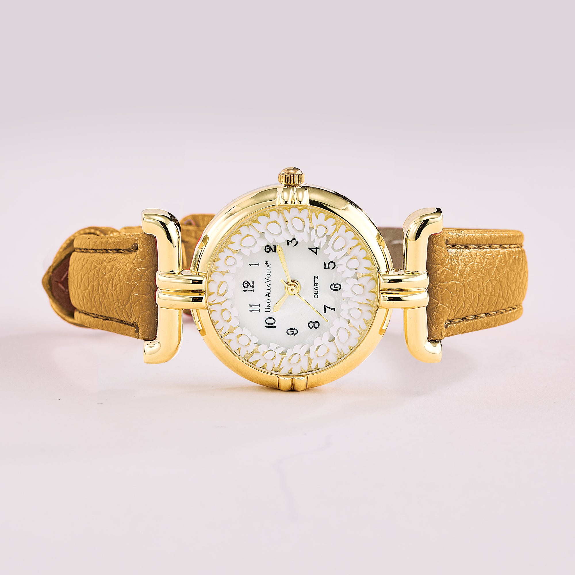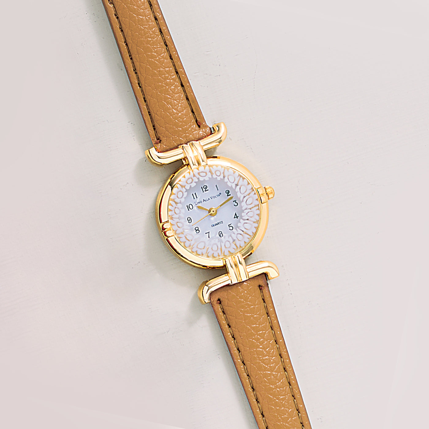 Murano Glass White Millefiori Watch with Camel Leather Band
