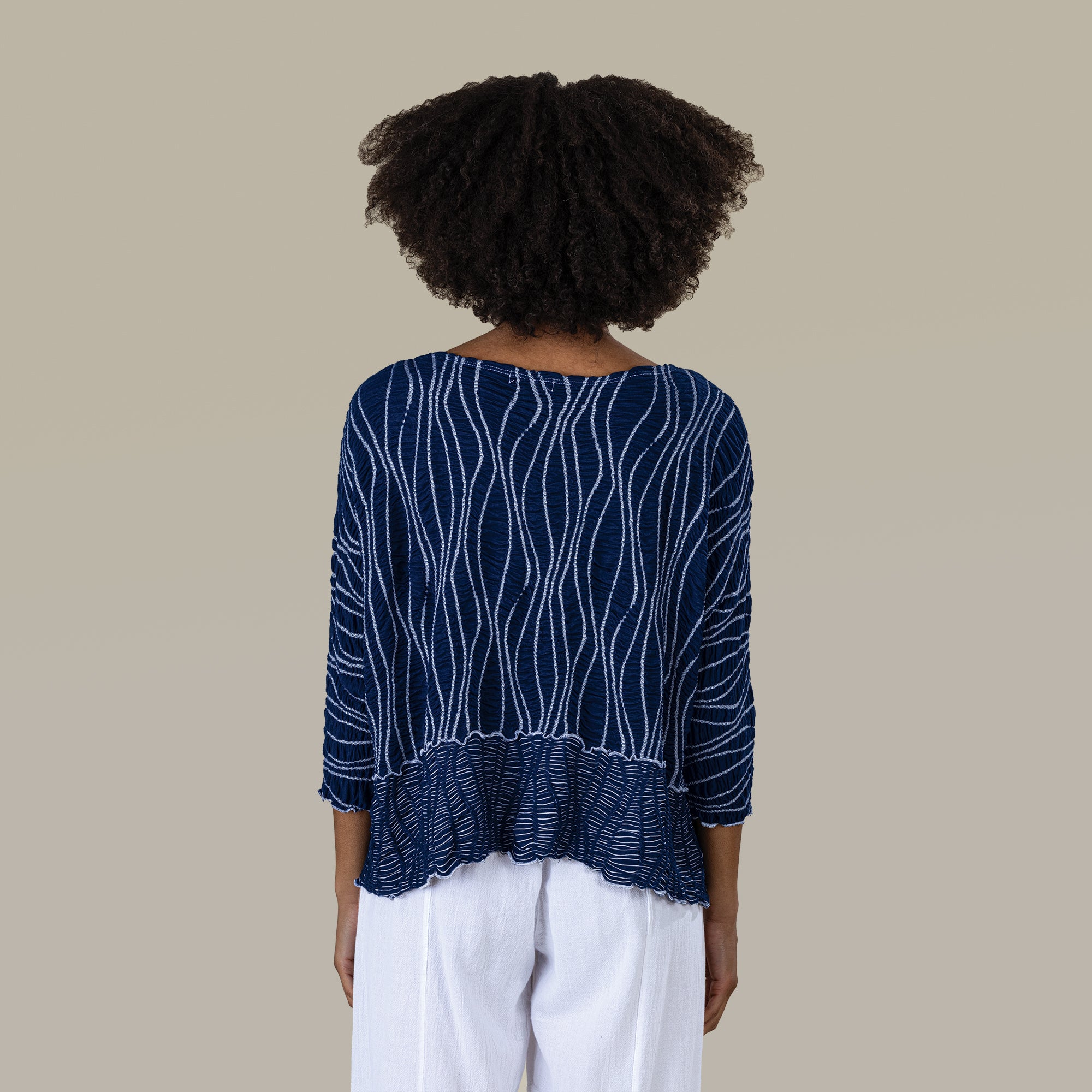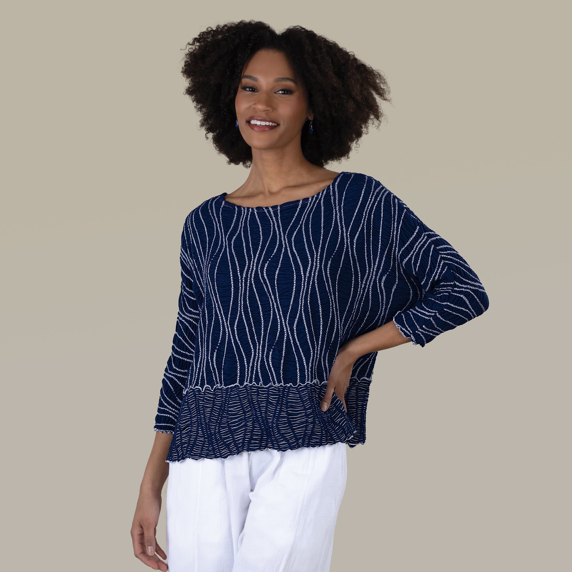Artisan Kristi of California designs this fun blouse with a mix of eclectic patterns in classic navy. Features 3/4-length sleeves and boat neck. Knit rayon and spandex. Machine wash and dry. Available in: S-6, M 8-10, L-12, XL-14, 1X 16-18, 2X-20, 3X-22.