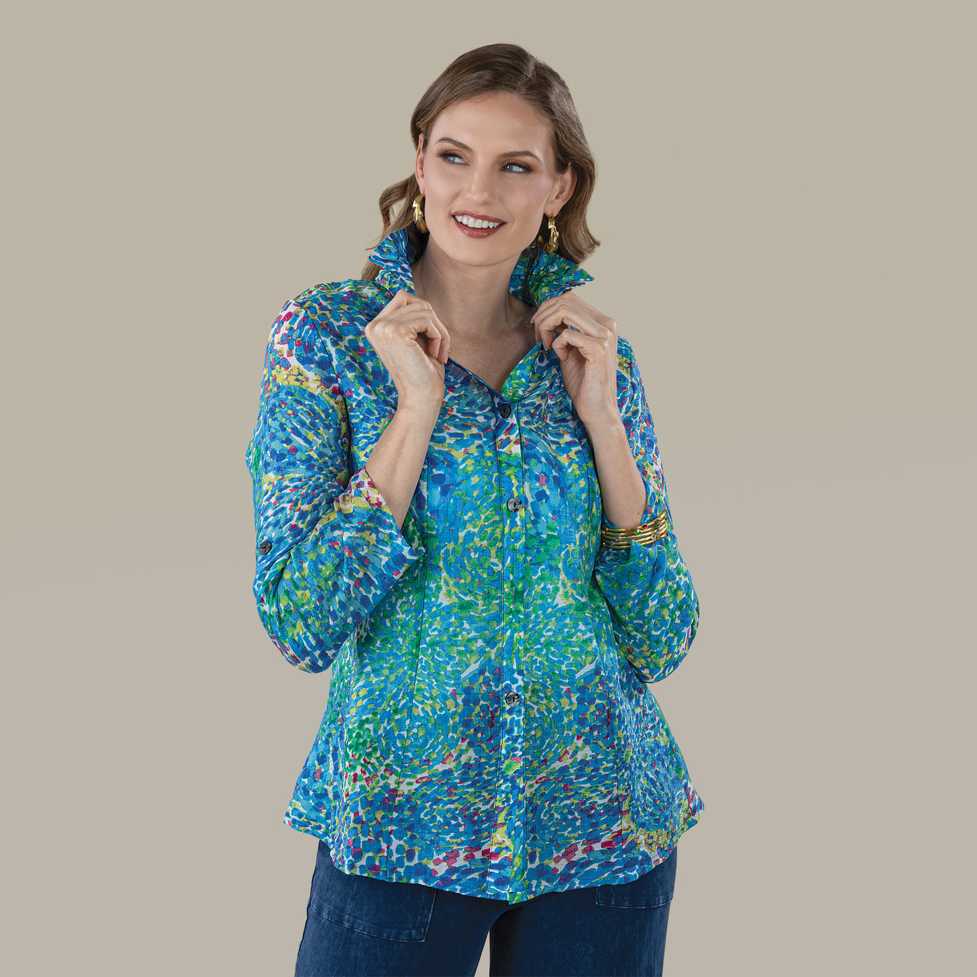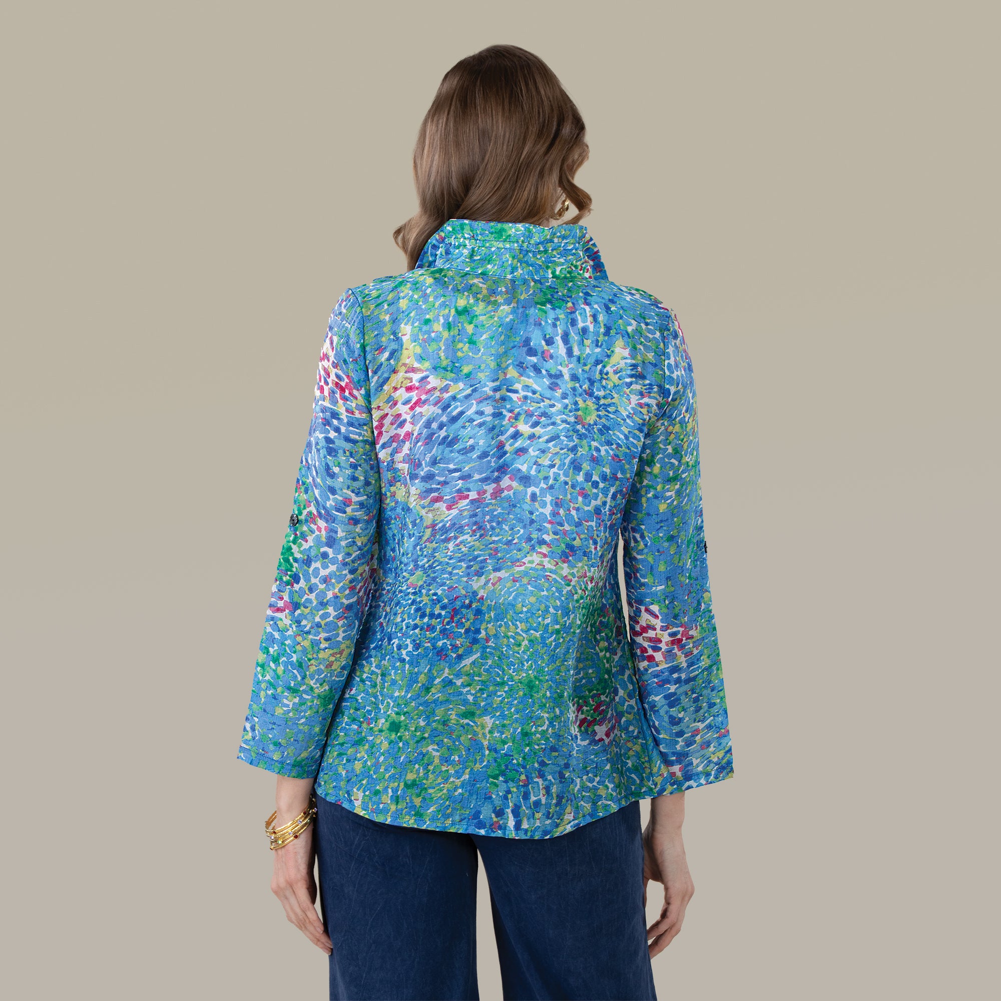 Trisha of South Korea creates this colorful and impressionist era-inspired blouse. Features green and blue hues, a-line styling, wired collar, and long sleeves. Rayon polyester mix. A beautiful seasonal top to take you from spring into summer. Machine wash. Available in: S 4-6, M 8-10, L 12-14, XL-16-18, XXL 20-22.