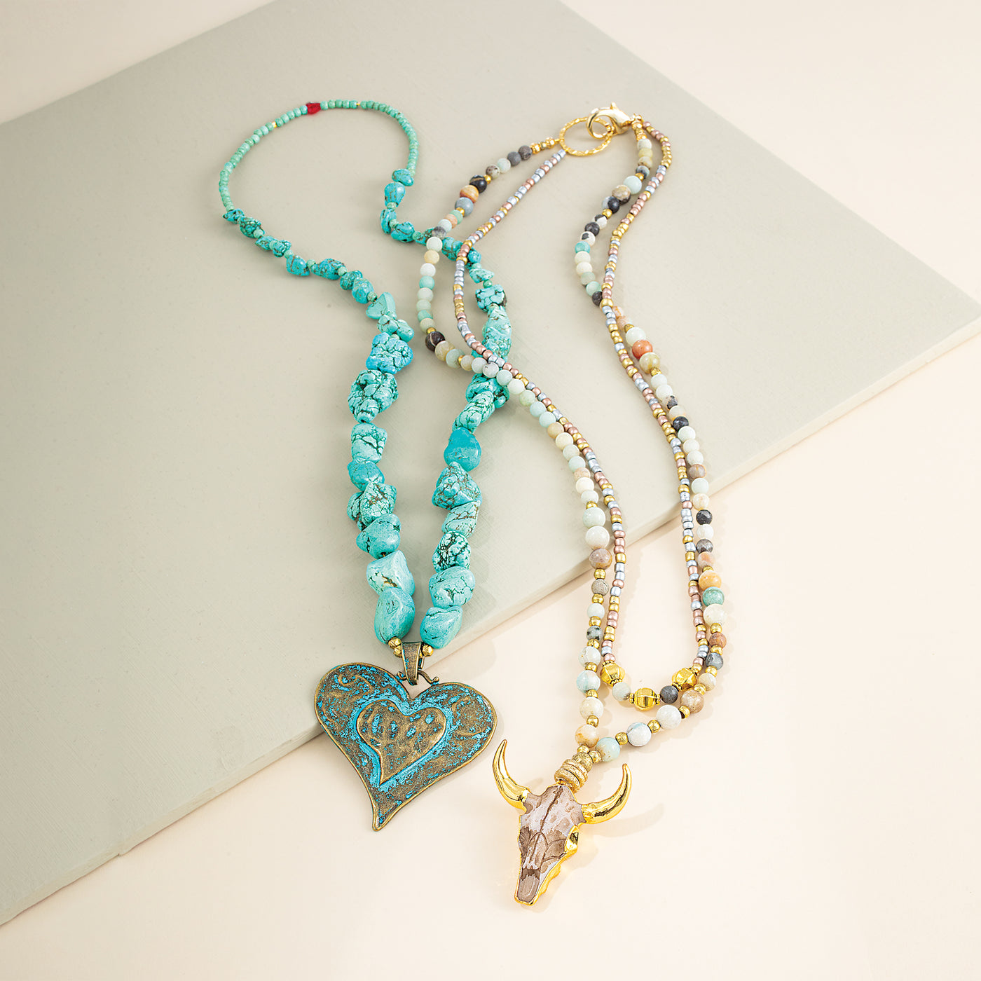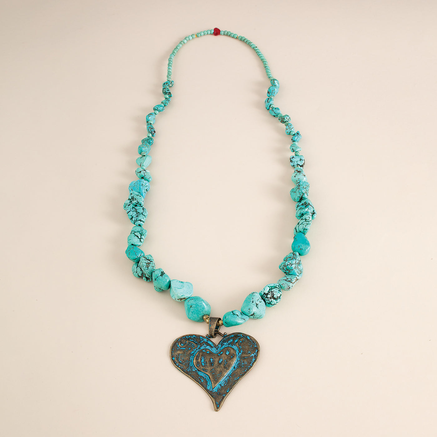Artisan Laurie of South Carolina handcrafts this statement necklace with an antiqued brass heart pendant and findings on a strand of turquoise nuggets. A tiny red glass heart accent is beaded into the strand. Handcrafted exclusively for Uno Alla Volta, from the hearts and hands of artisans. Approx. 30'' long, 2.5'' pendant.