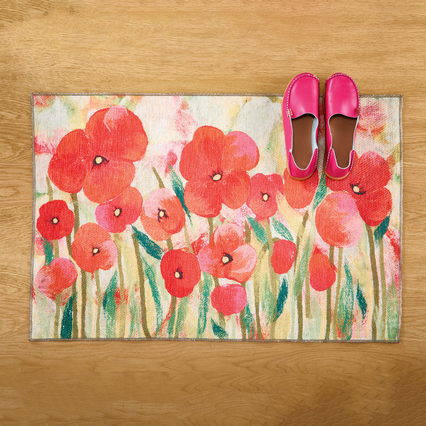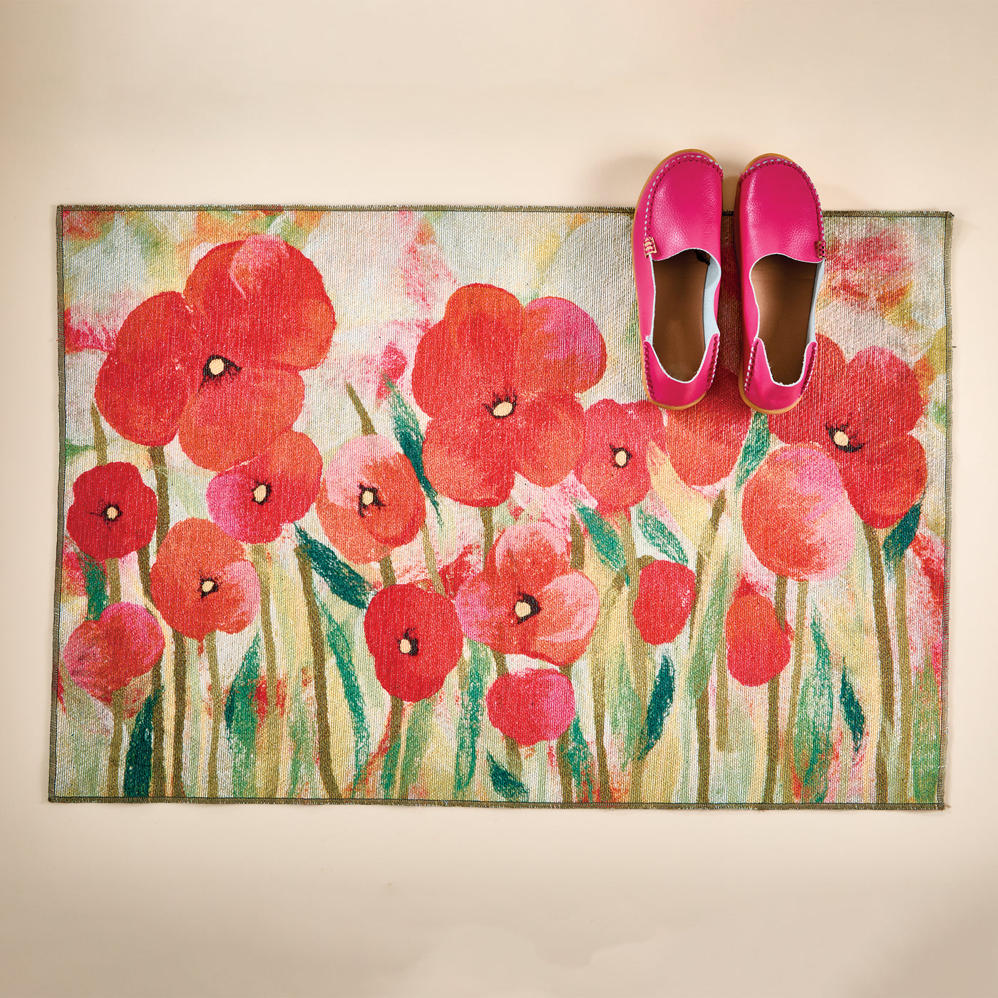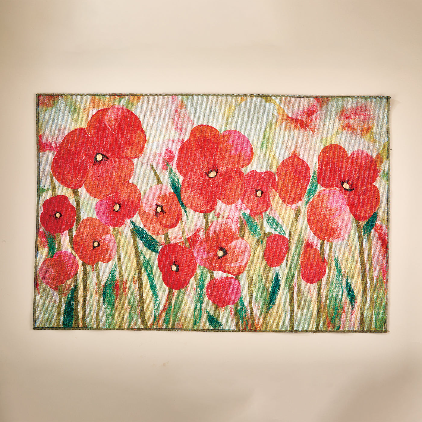 This original poppies artwork, created by artisan Liora of New York, is hand-stitched onto layered polyester with a proprietary three-dimensional technique. Designed in New York, hand-loomed in Turkey. Indoor/outdoor. Non-skid back, machine washable polyester. Approx. 35'' x 23''.
