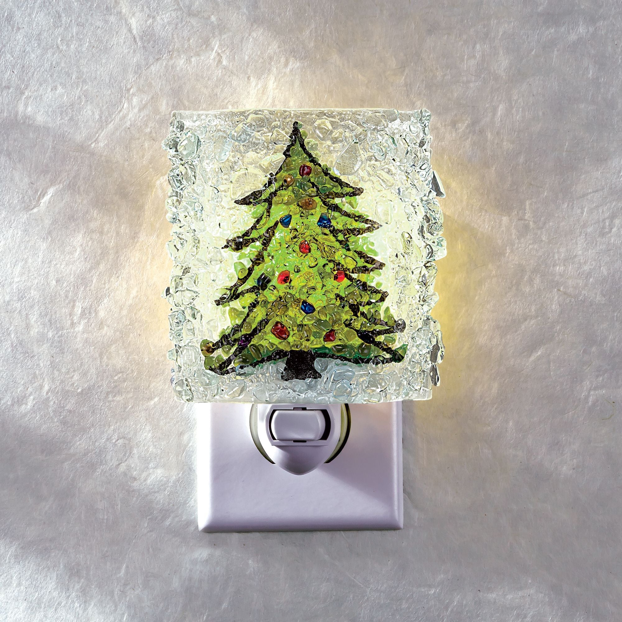 For nearly two decades, the eco-conscious Gray family of Florida has recycled discarded glass into uniquely translucent nightlights, such as this Christmas tree nightlight. Every day in the family-run business, recycled glass from local restaurants is crushed, then fused in an energy-efficient kiln to create unique, seasonal nightlights. Handcrafted exclusively for Uno Alla Volta, from the hearts and hands of artisans. Compatible with vertical and traditional plugs. Approx. 3'' x 3.5'', with a 4 watt bulb.