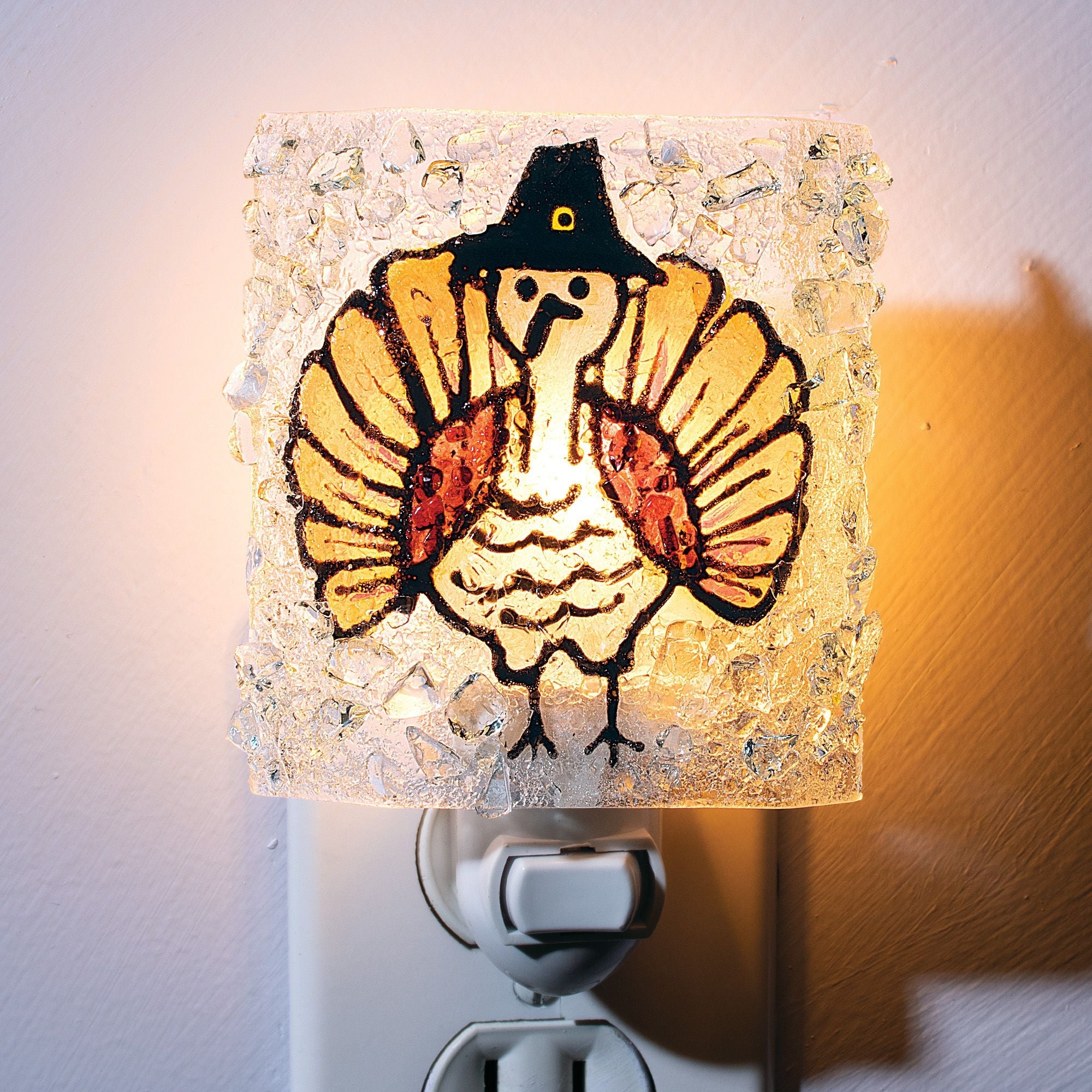 Our eco-conscious Florida artisans handcraft this adorable nightlight from recycled glass. Each is fired in an energy-efficient kiln, and includes an on/off switch and a 4 watt bulb. Handcrafted for Uno Alla Volta, from the heart and hands of the artisan. Compatible with vertical and traditional plugs. Approx. 3'' x 3.5''.