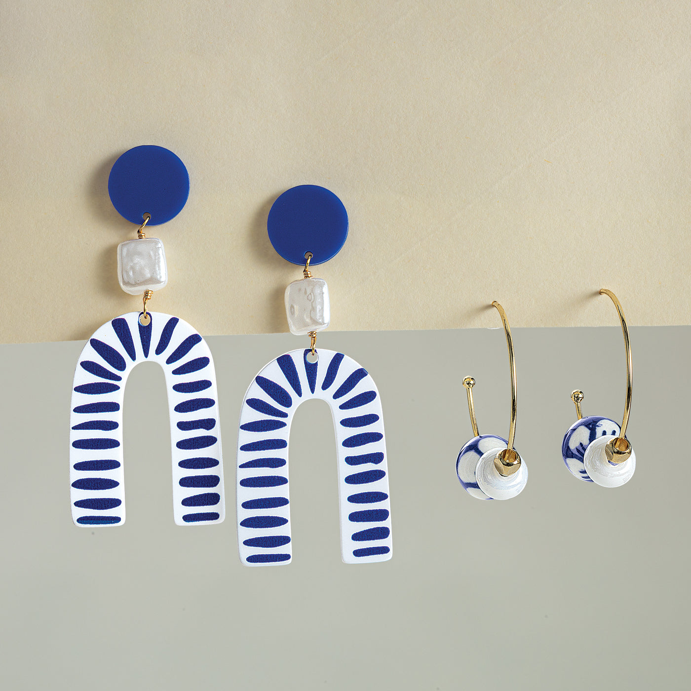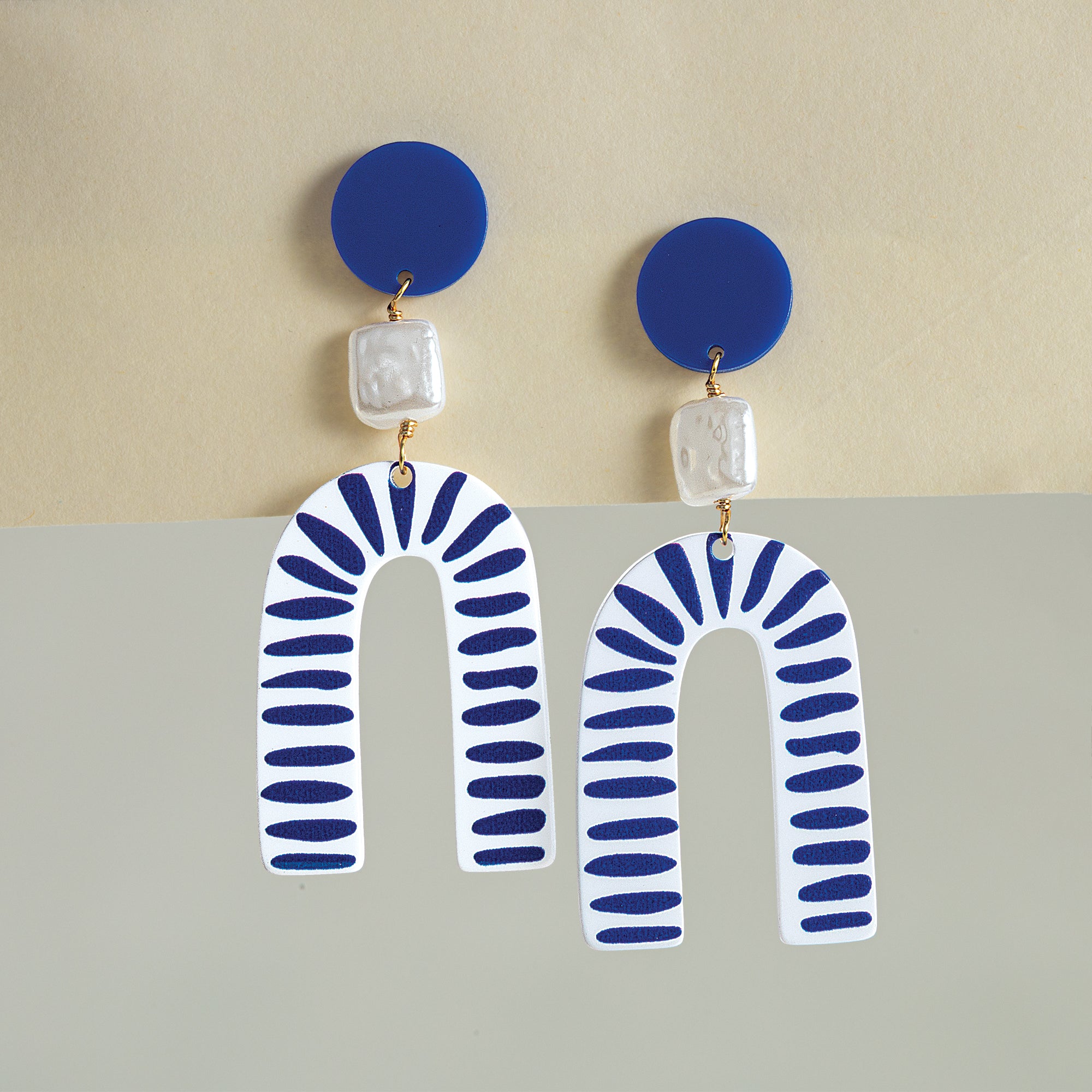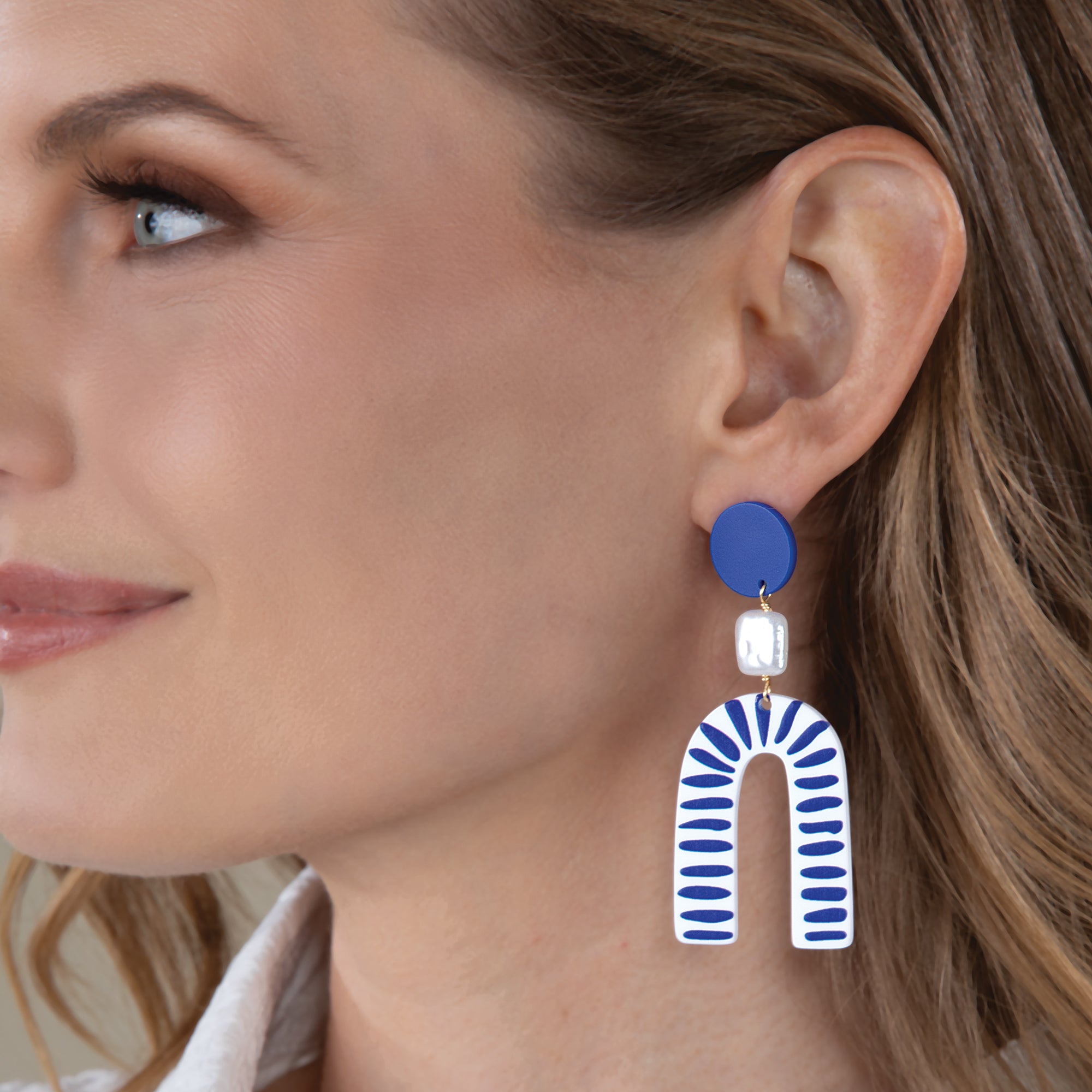 Fun and funky, these blue and white earrings are designed by artisan Vivian of Texas. Perfect to wear with anything from jeans to leggings to a maxi dress. Designed in Texas, made in Thailand. Approx. 3'' long, posts.
