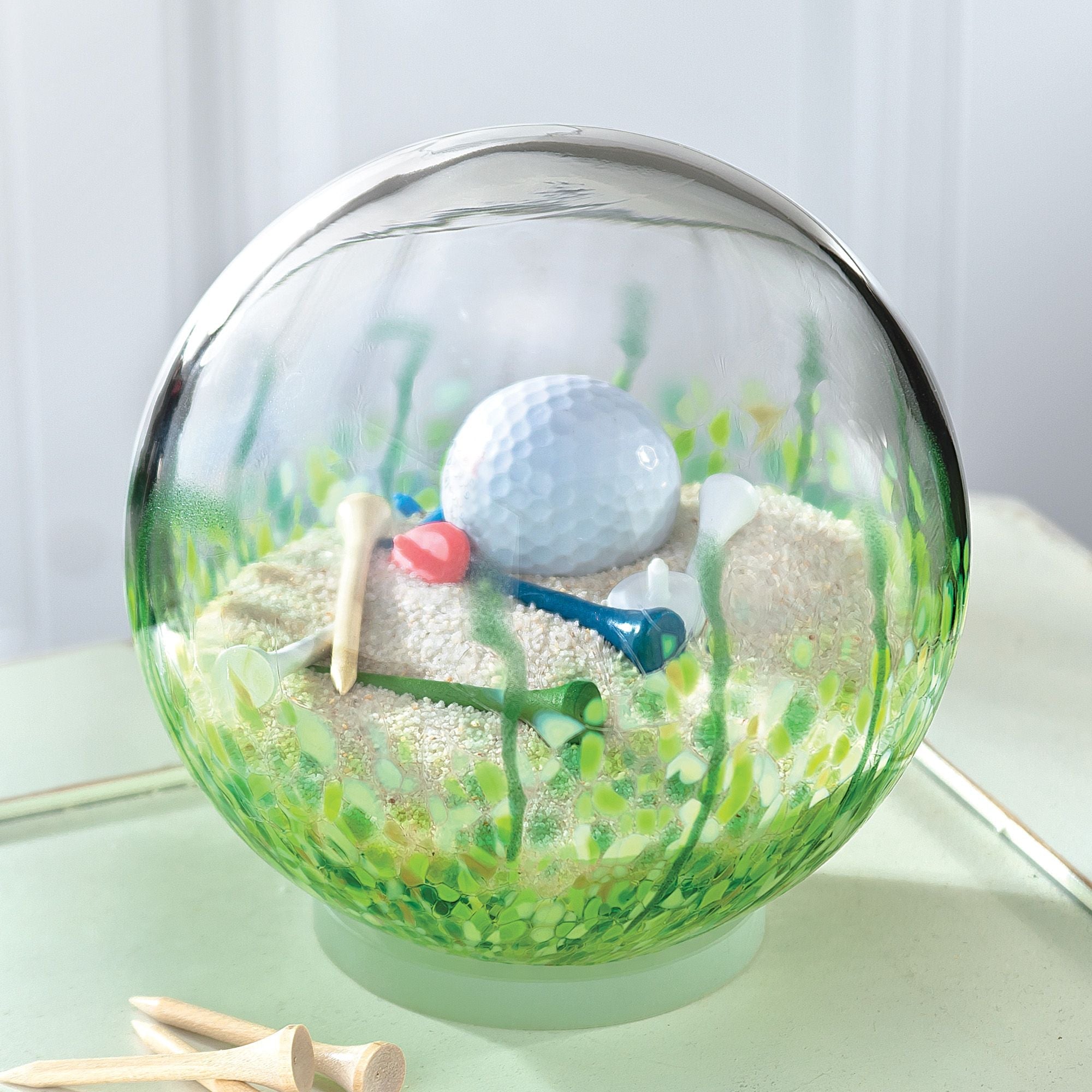 Shake this whimsical paperweight and maybe it will improve your ''lie in the sand''. Each clear glass globe is individually hand-blown then filled with sand, tees, a ball marker and ball. Approx. 6.5'' dia.