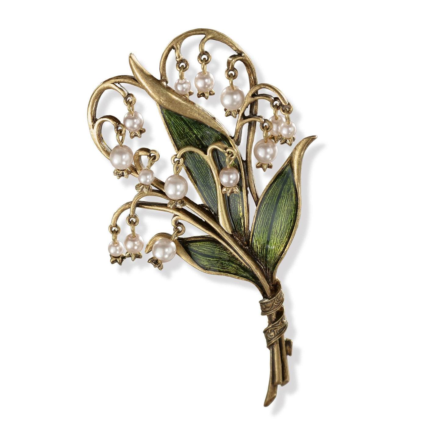 A designer, artisan and historian of jewelry, Shelley handcrafts her nostalgic jewelry to reflect her passion for the past. In her Los Angeles studio, she combines burnished brass-plated pewter with glass pearls and rich enamel to create a lavish vintage look for this brooch. 2.5 in. x 4 in.