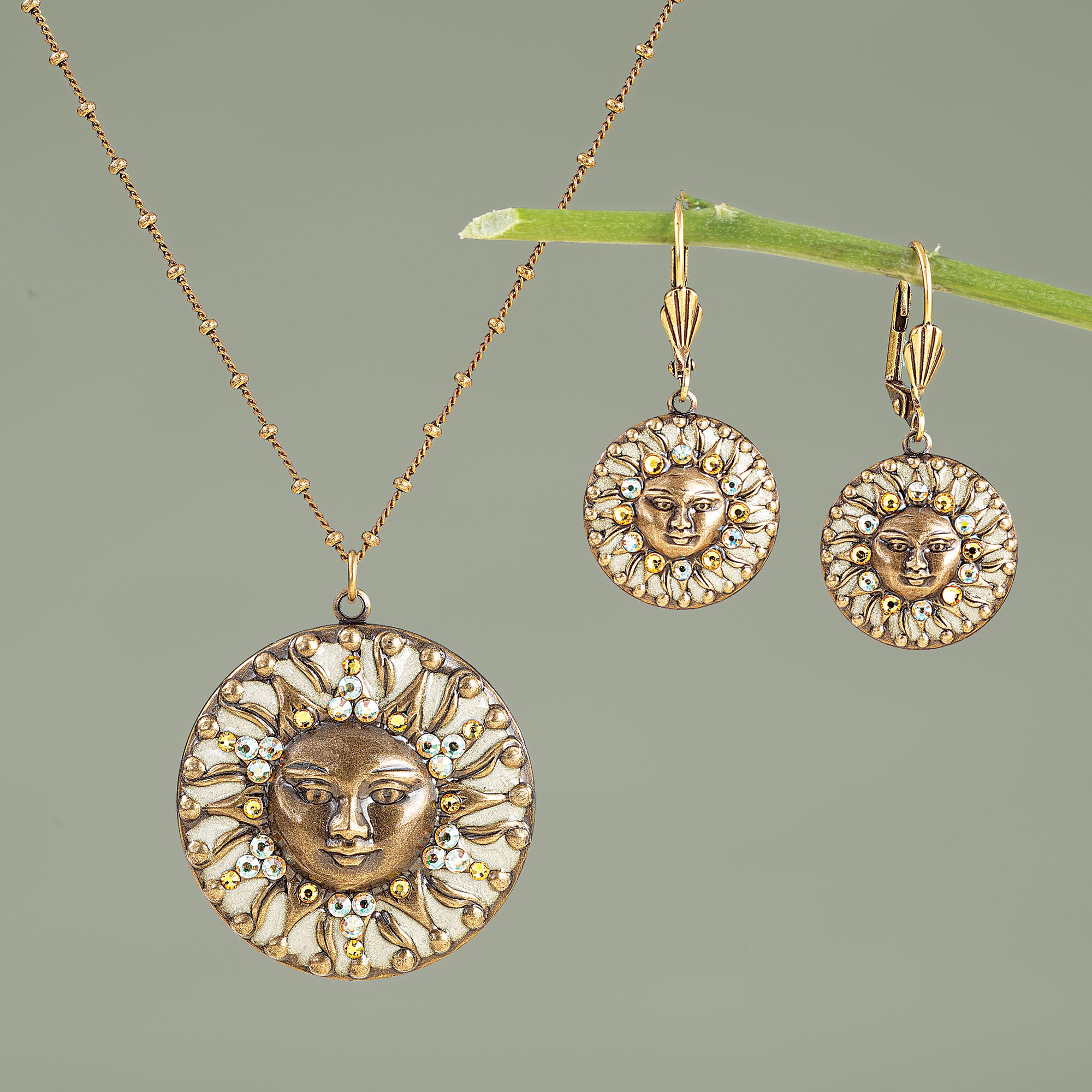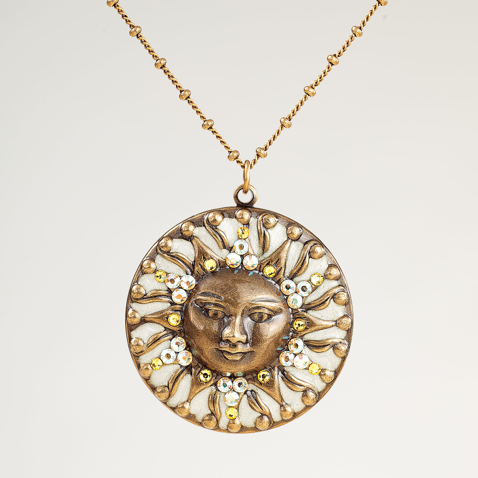 Anne of New York designs this unique medallion pendant, handcrafted of antiqued brass. A delicate, enameled sun face is hand-set with crystals for a touch of shimmer then suspended from a bead station chain. Approx. 16'' long, 2'' ext., 1.5'' pendant, lobster clasp.