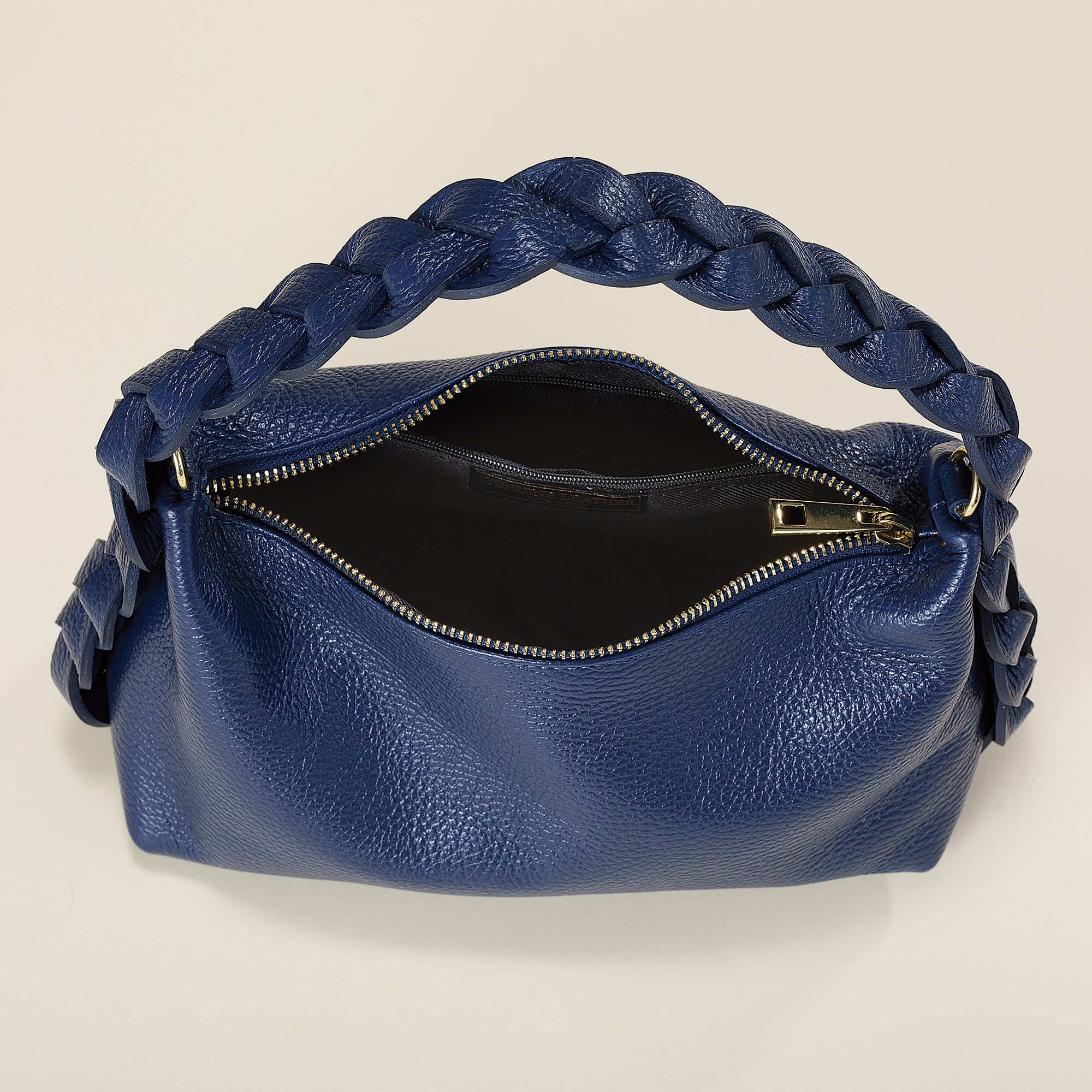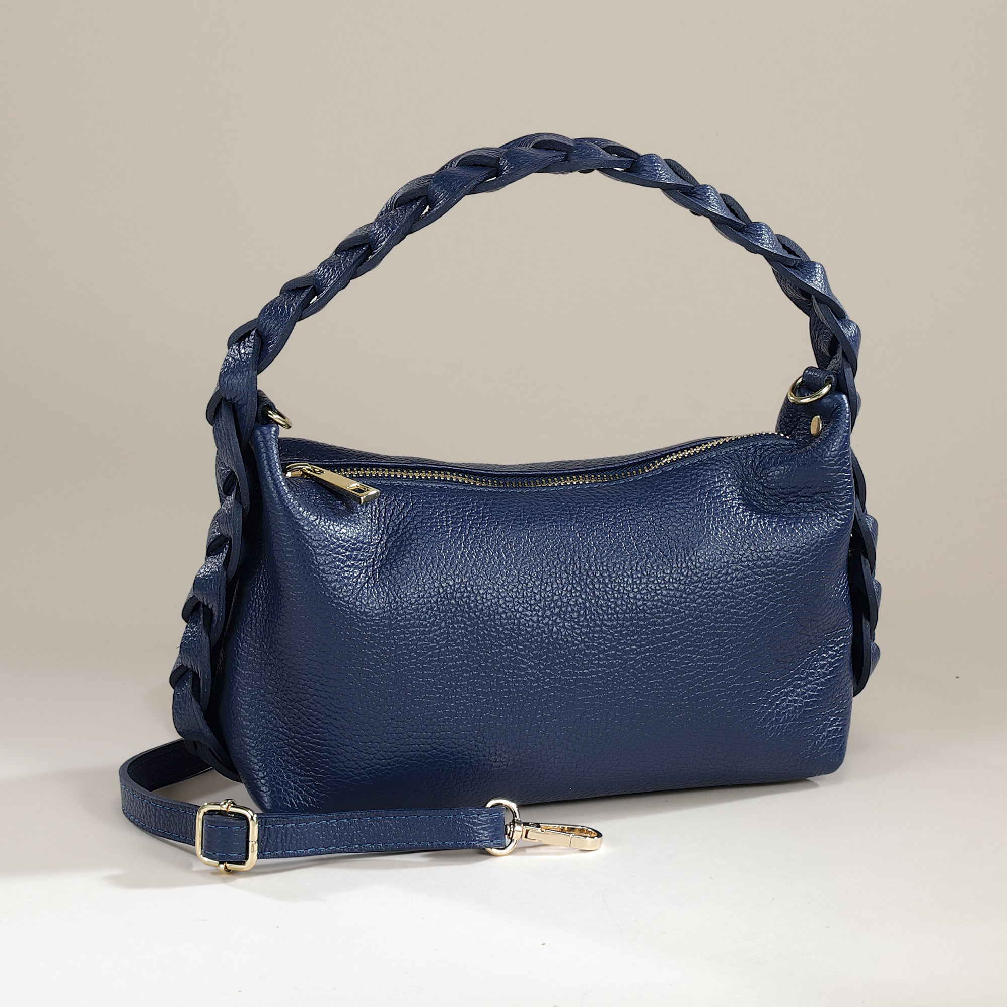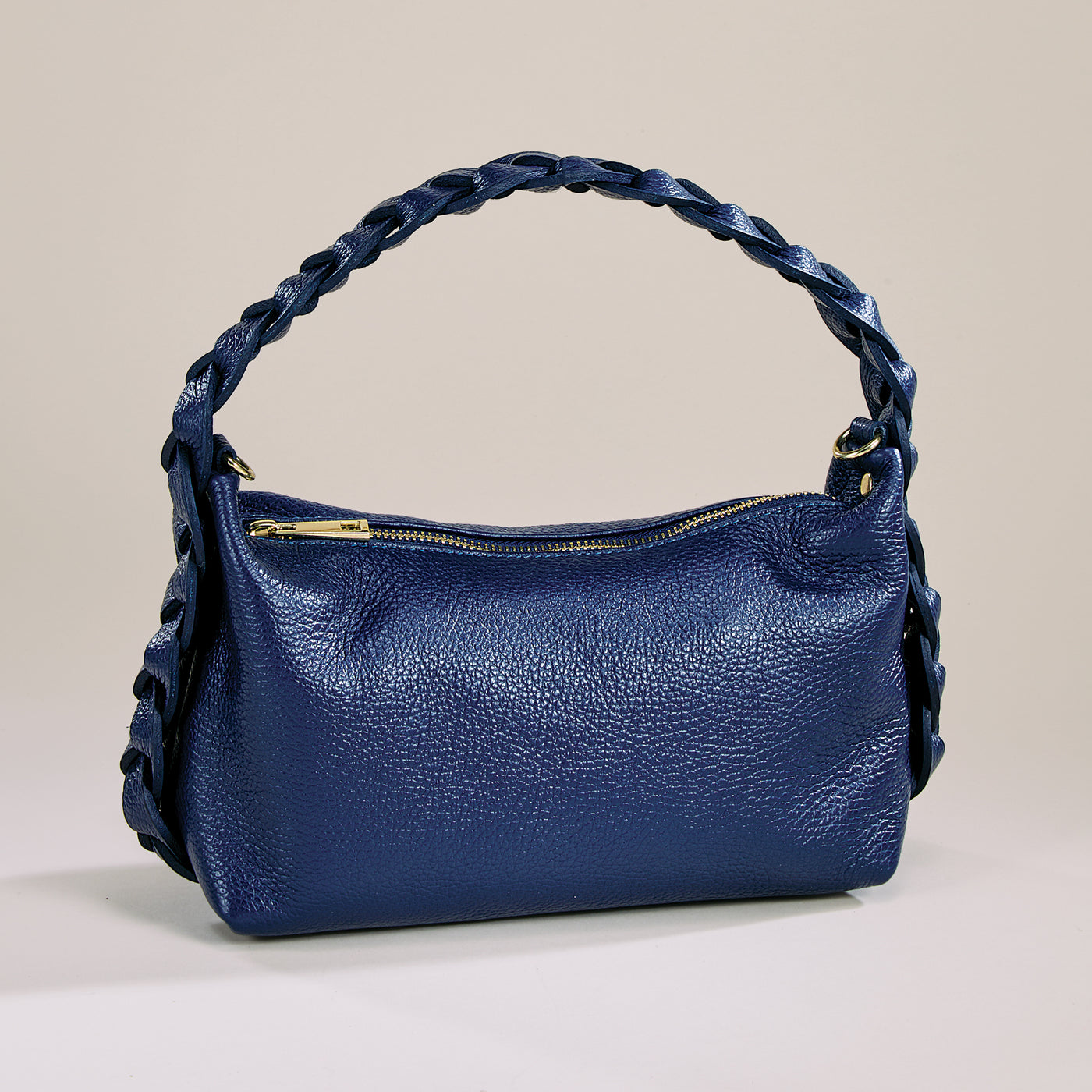 Marco of Florence designs this classic navy bag in subtly textured and supple Italian leather with braided detailing. Approx. 10'' x 4'' x 6'', it features a 9'' handle, a 23'' removable adjustable shoulder strap and an interior zipper pocket. Cloth lined with a zipper closure.