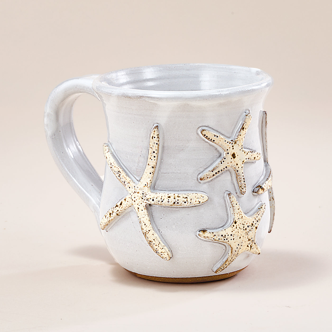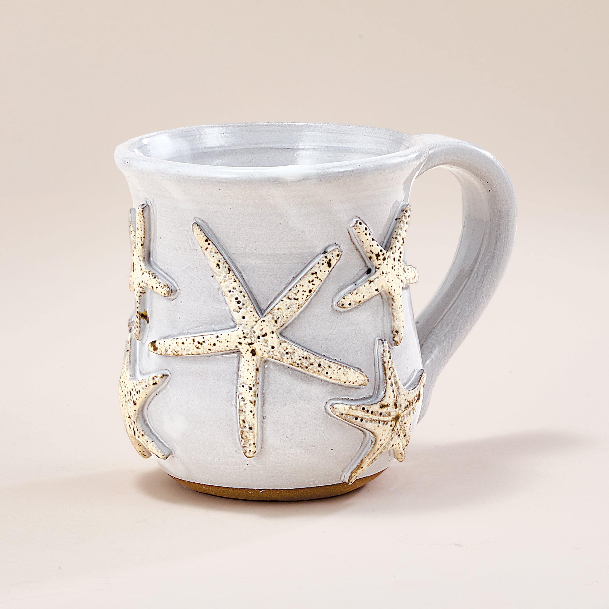 Hand-thrown on a pottery wheel by JoAnn of the Poconos, this sweet stoneware mug features several starfish. Handcrafted exclusively for Uno Alla Volta, from the hearts and hands of artisans. Microwave, dishwasher and food safe. Approx. 5'' tall, holds 14 oz.