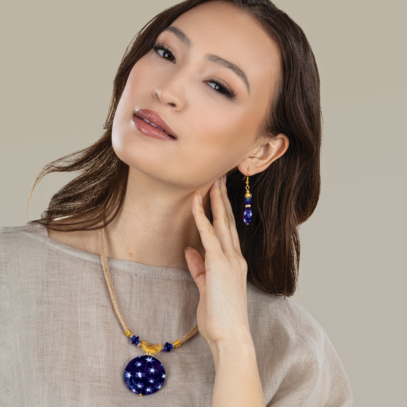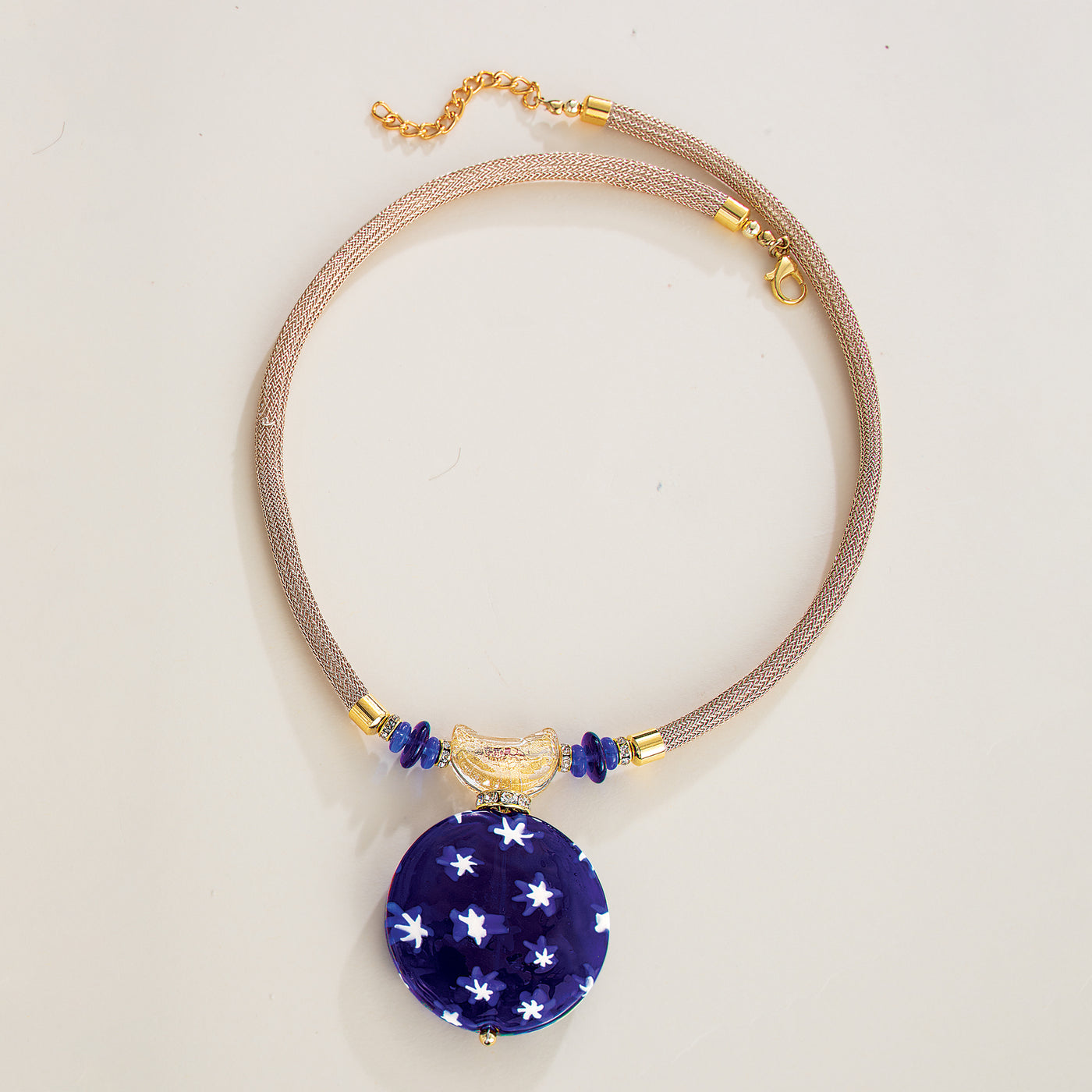 Artisans Valentina and Alessandra of Venice design this eye-catching navy Murano glass pendant, detailed with white glass stars. Set in gold-plated findings, it is suspended from woven cotton cord. Handcrafted exclusively for Uno Alla Volta, from the hearts and hands of artisans. Approx. 18'' long, 2'' pendant, 2'' ext., lobster clasp.