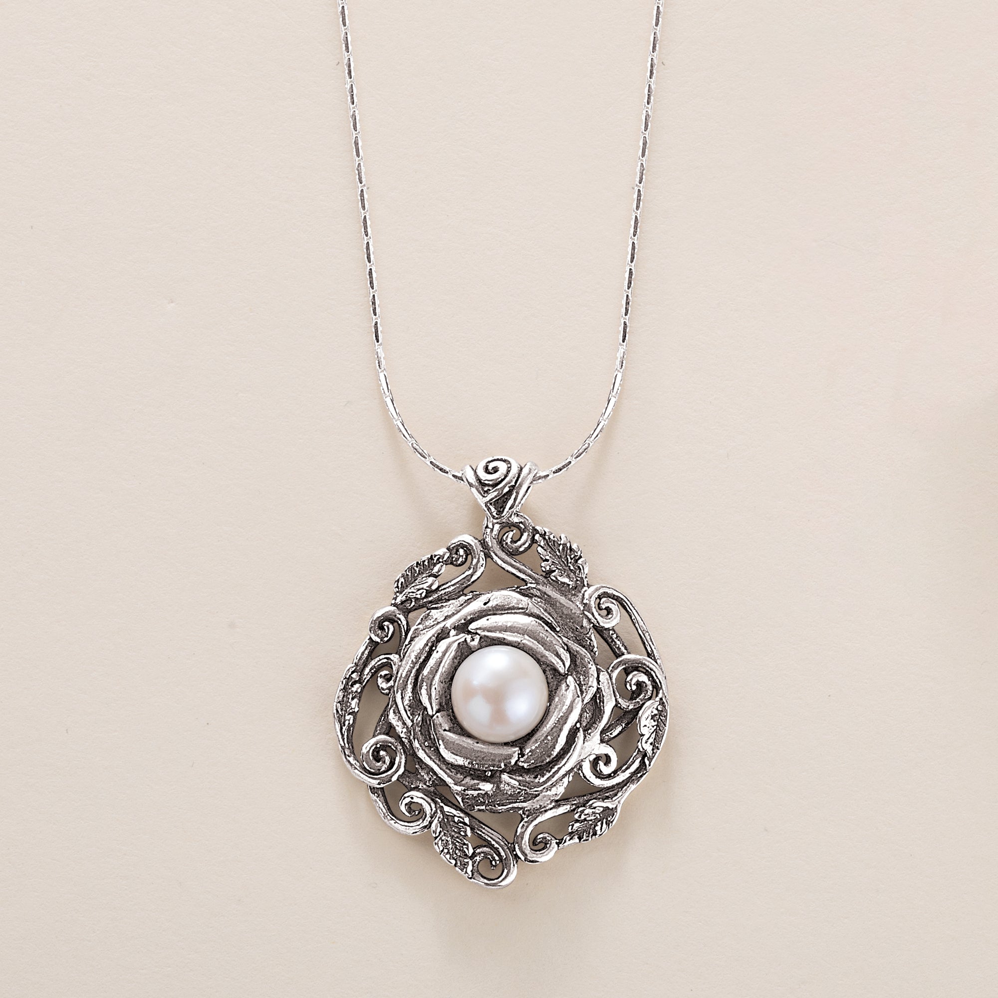 Tamir of Israel designs and handcrafts this necklace featuring a glass pearl nestled in a freeform sterling silver frame. Pairs perfectly with the Sterling Silver Nestled Pearls Earrings. Approx. 17.5'' long, 1.25'' pendant, lobster clasp.