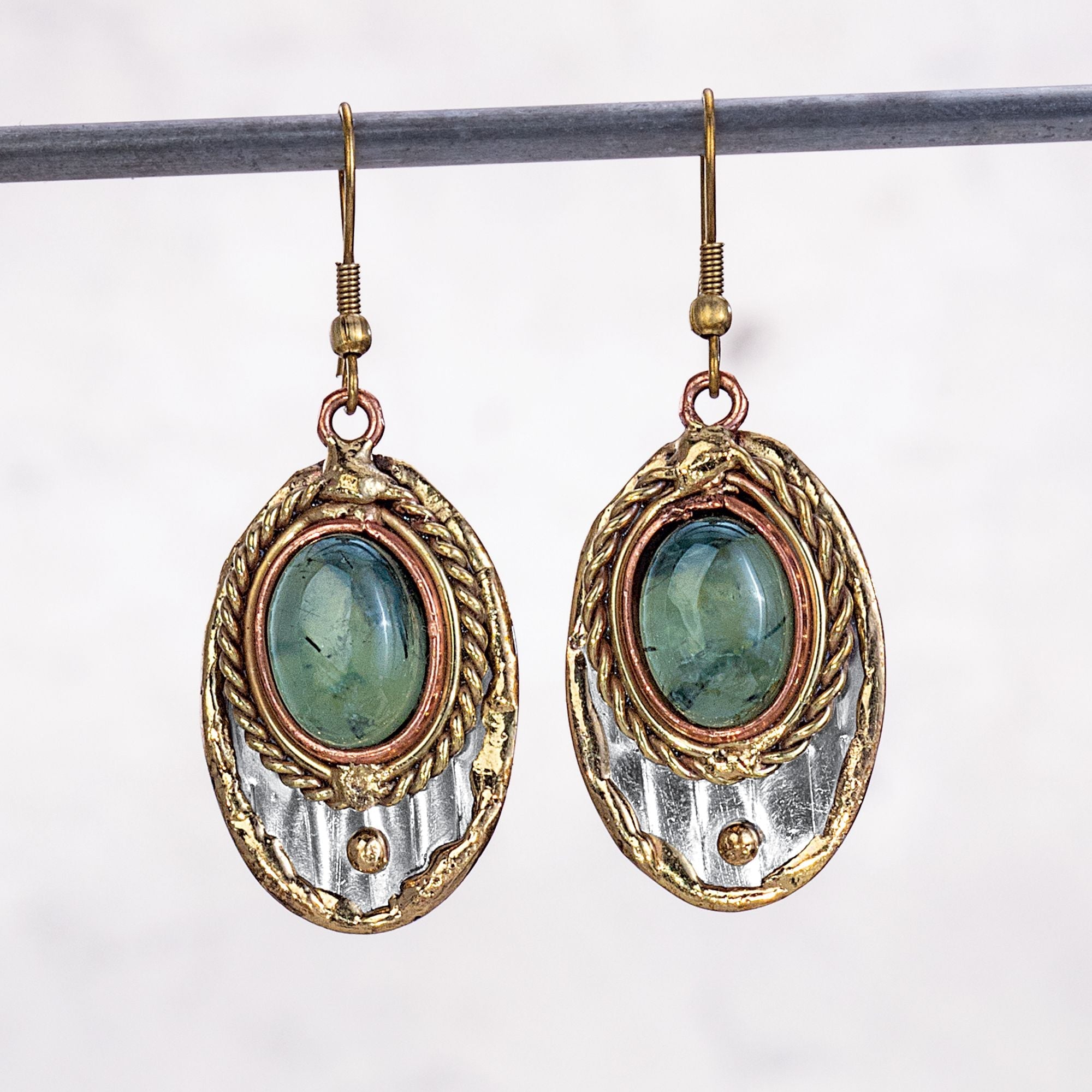 Growing up amid the exotic natural beauty of Rajasthan, India, our artisan developed a passion for design at an early age. Today, she creates these exquisite earrings from swirling forms of stainless steel, copper, and brass accented with genuine moss agate - a stone believed to bring tranquility to its wearer. The color, shape, and size of each natural stone may vary. Handcrafted for Uno Alla Volta, from the heart and hands of the artisan. Dimensions - 2.25'' long, wires.