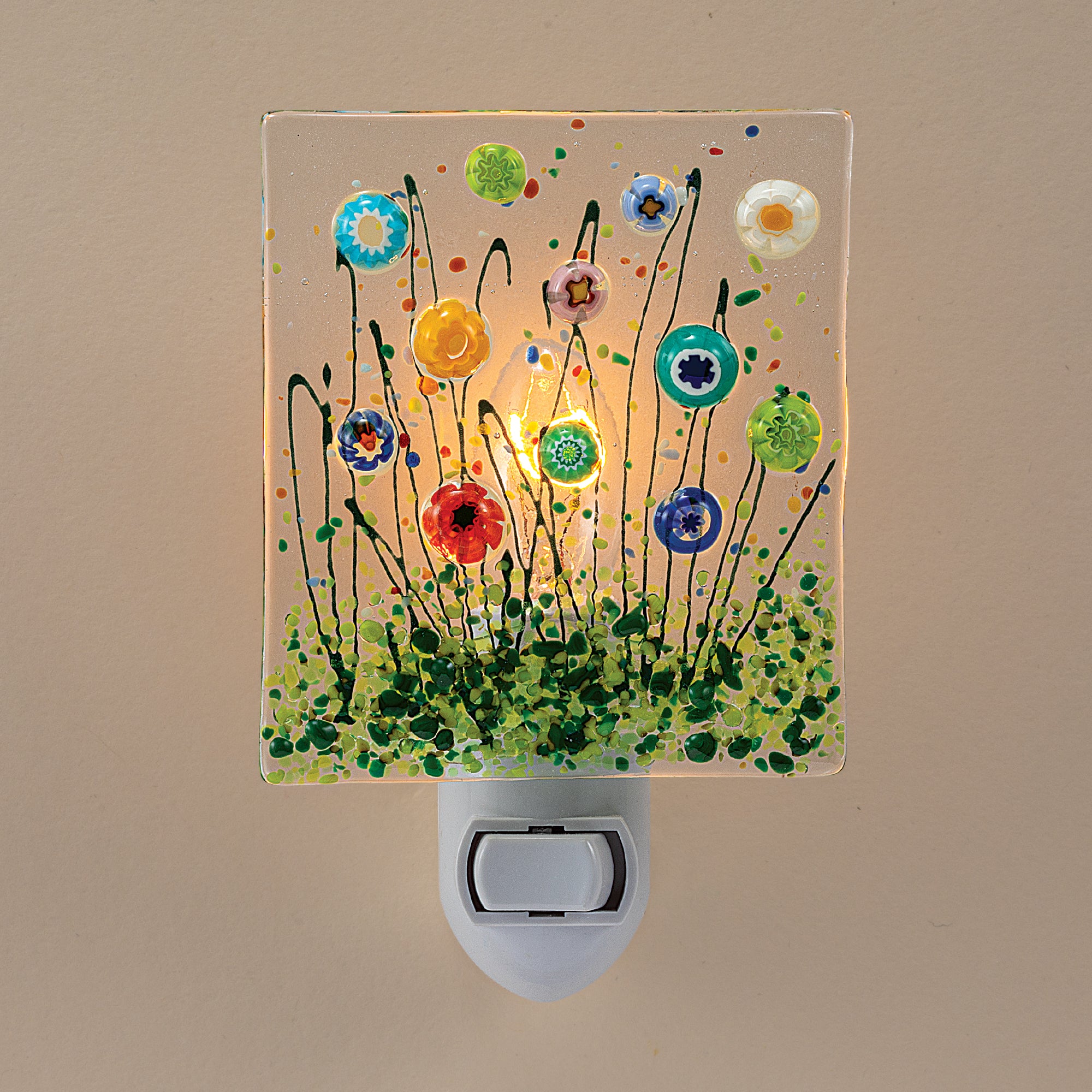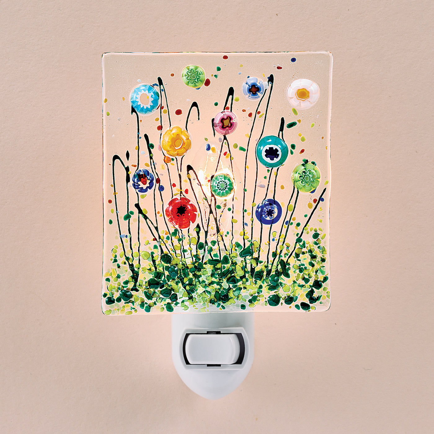 Artisan Charity of Oregon, influenced by the art and techniques of millefiori, designs and handcrafts this fun, floral nightlight with Italian Murano glass. She uses colored glass rods that are fused together then sliced to reveal beautiful flower-like patterns. This nightlight features intricate enamel detailing and colored millefiori may vary. Compatible with vertical and traditional plugs. Approx. 5'' x 3''.